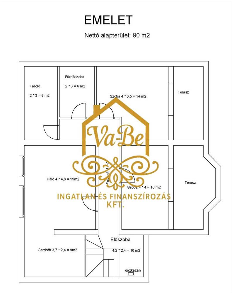 Emeleten (110 m²): 3 külön nyíló szoba (14, 16 és 19 m²), fürdőszoba, gardrób, tároló és terasz.