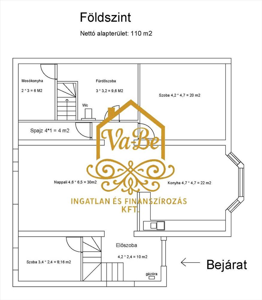 Földszinten (110 m²): Tágas nappali (30 m²), konyha-étkező (22 m² – villany és gáz főzési lehetőség is kiépítve), hálószoba (20 m²), fél szoba, fürdő, spejz és mosókonyha.