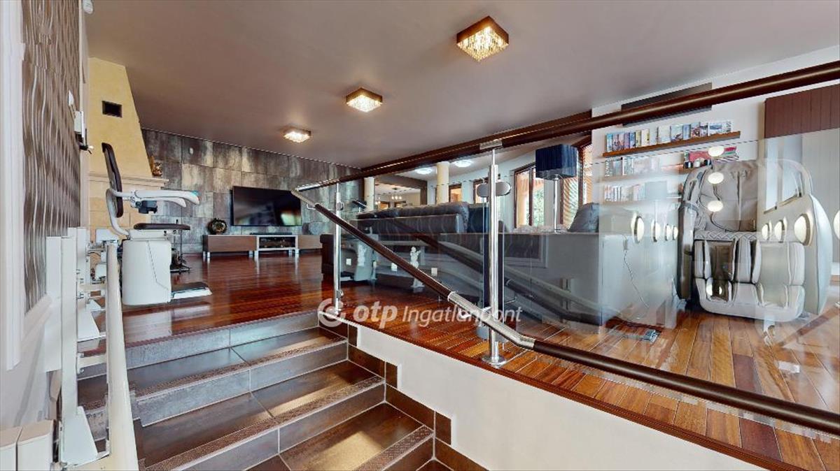 Az alsó szinten került kialakításra egy elegáns előszoba, 36 m2-es dolgozó szoba, 30 m2-es vendégszoba, tágas konditerem, rendkívül hangulatos közel 15 m2-es borospince és a háztartási helység.