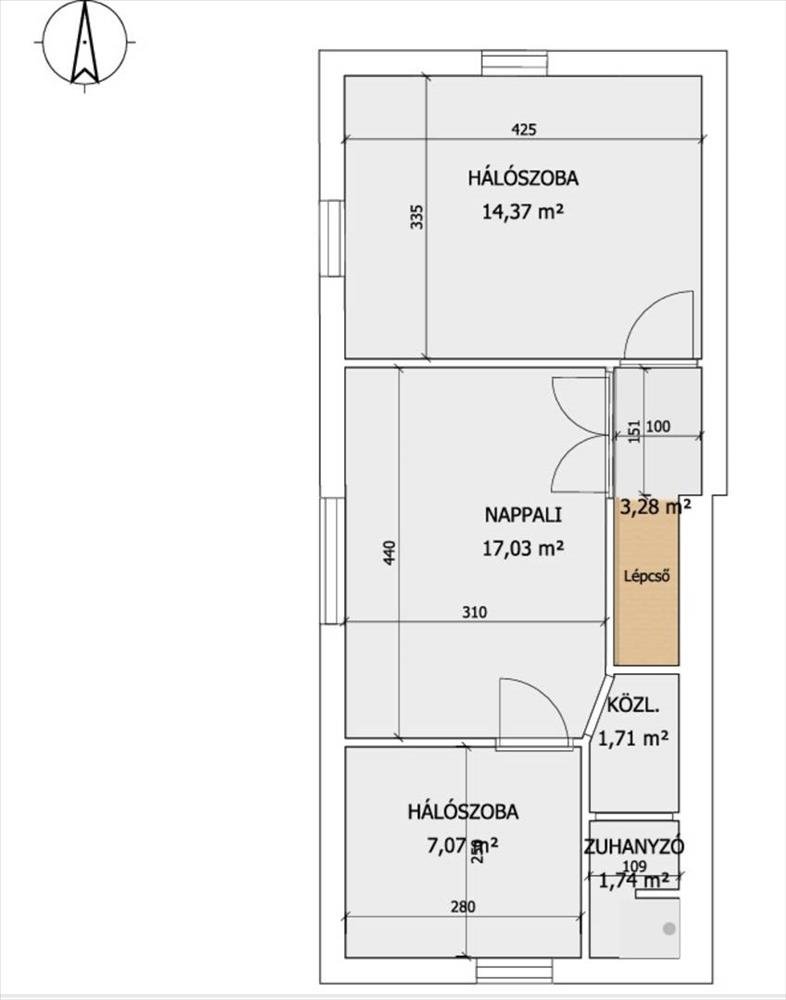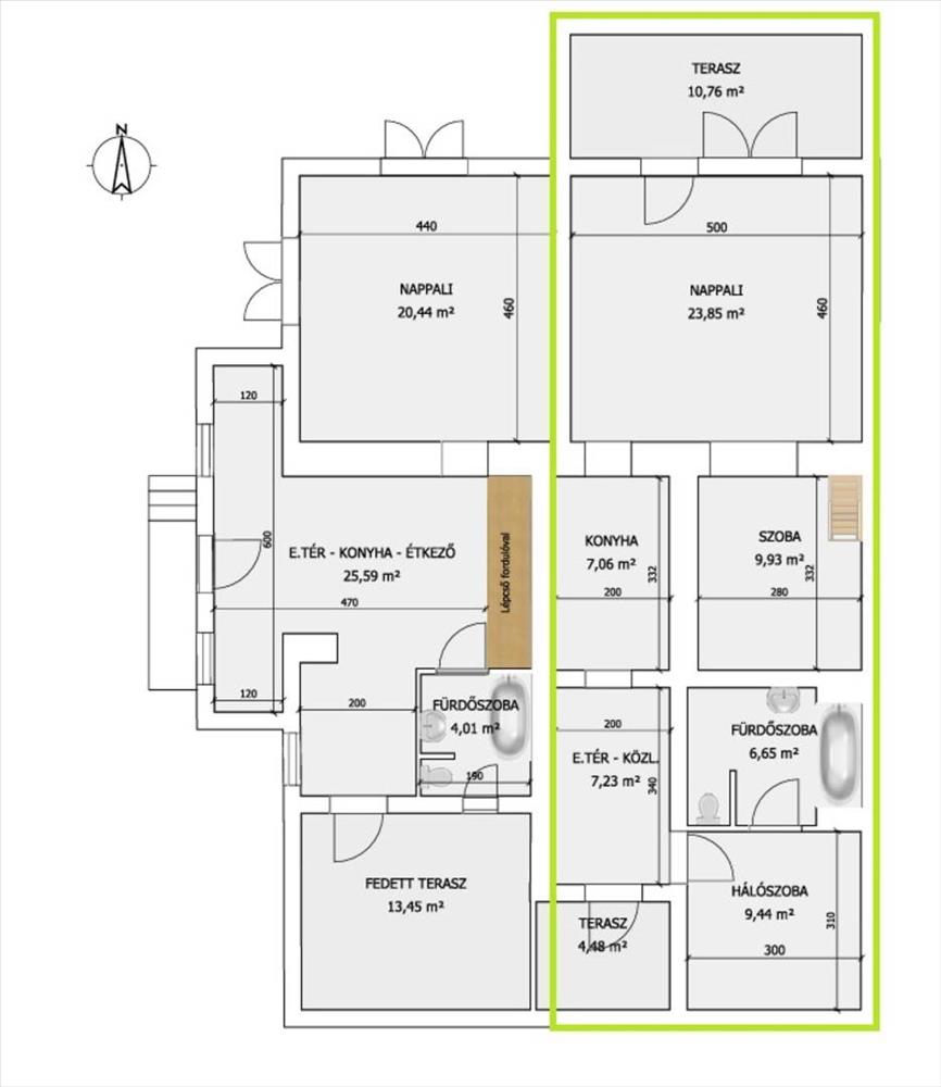 Az ház földszint + tetőtér építésű, nappali+ 3 szobás, észak-déli fekvésű, csendes és világos, a terasz déli fekvésű.