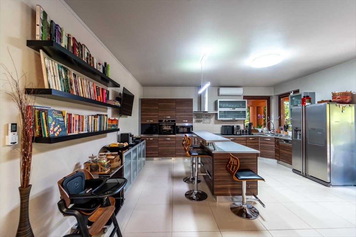 A nappaliból három tágas hálószoba nyílik, mindegyik saját fürdőszobával, gardróbbal és erkéllyel. a konyha teljesen gépesített, középen egy elegáns konyhaszigettel, amely körül a családi étkezések és baráti összejövetelek központi helyszíne alakulhat ki. Innen nyílik az 53 m²-es fedett terasz, ahol az épített kemence lehetőséget ad arra, hogy a főzés szabadtéren is folytatódhasson, miközben a kert és a panoráma látványa minden alkalommal új élményt nyújt.