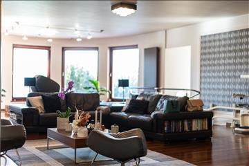 A házba érkezve már az előtér eleganciája megadja az alaphangulatot. Innen egy légies, igényes kialakítású lépcsőházon keresztül jutunk fel a felső szintre, ahol a 93 m²-es, amerikai stílusú nappali–étkező–konyha egyetlen hatalmas élettérré olvad össze. a nappali középpontjában az egyiptomi márványból és homokkőből készült kandalló uralja a teret, a padlóba süllyesztett, körpanorámás, hatfős jakuzzi pedig a kényelem legmagasabb szintjét kínálja. a nappali brazil valódi fa parkettával burkolt, padló- és szegélyfűtéssel kiegészítve, hogy minden évszakban tökéletes komfortot biztosítson.