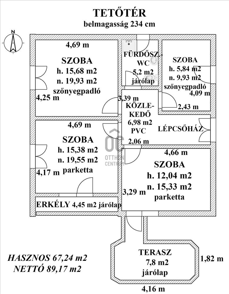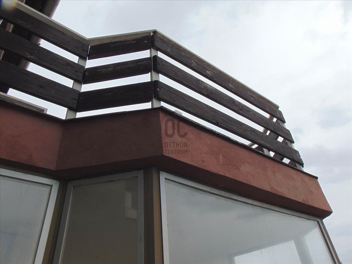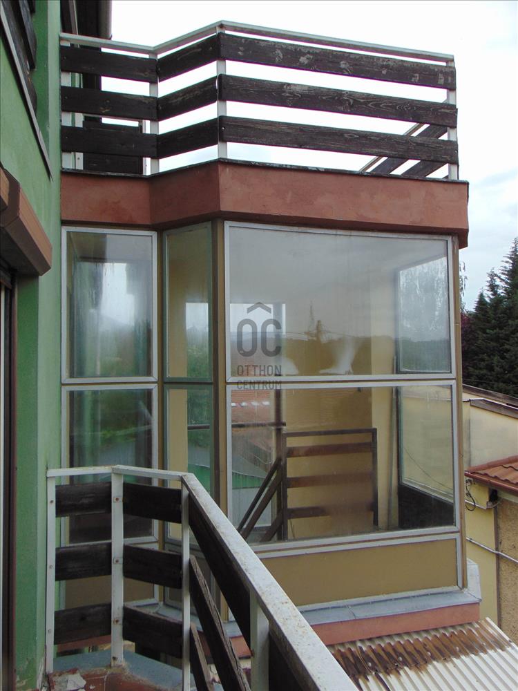A tetőtér hasznos alapterülete 67, az alacsony részekkel együtt 89 nm . Két parkettás és két szőnyegpadlós hálószoba, egy zuhanyzós fürdőszoba-wc helyiség és a délnyugati szobához saját erkély állnak rendelkezésre. a délkeleti szobából közelíthető meg az üvegfalas lépcsőház tetején kialakított tetőterasz, ahonnan a négy égtáj felé nyílik kilátás a Nagy Eged-hegy, a felsőtárkányi Vár-hegy, a Bükk főgerince és a várost körülvevő dombok panorámájával.