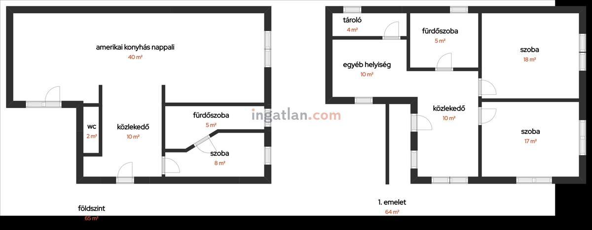 64 m2 emelet - közlekedő, tároló, fürdőszoba wc-vel, 2 szoba