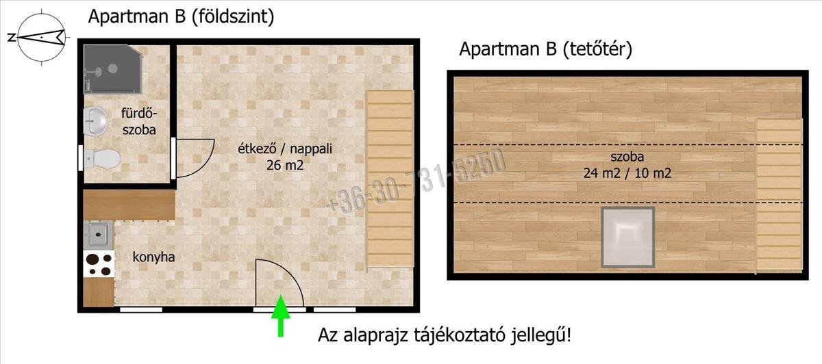 A második apartmanház kétszintes, beépített tetőtérrel. a földszinten egy szoba, konyha és fürdő található, az emeleten pedig egy további hálószoba. a fűtésről gázkonvektor, a meleg vízről villanybojler gondoskodik, és itt is mindkét szinten klíma garantálja a komfortot. a burkolatok a földszinten kerámia, a tetőtérben laminált lap.