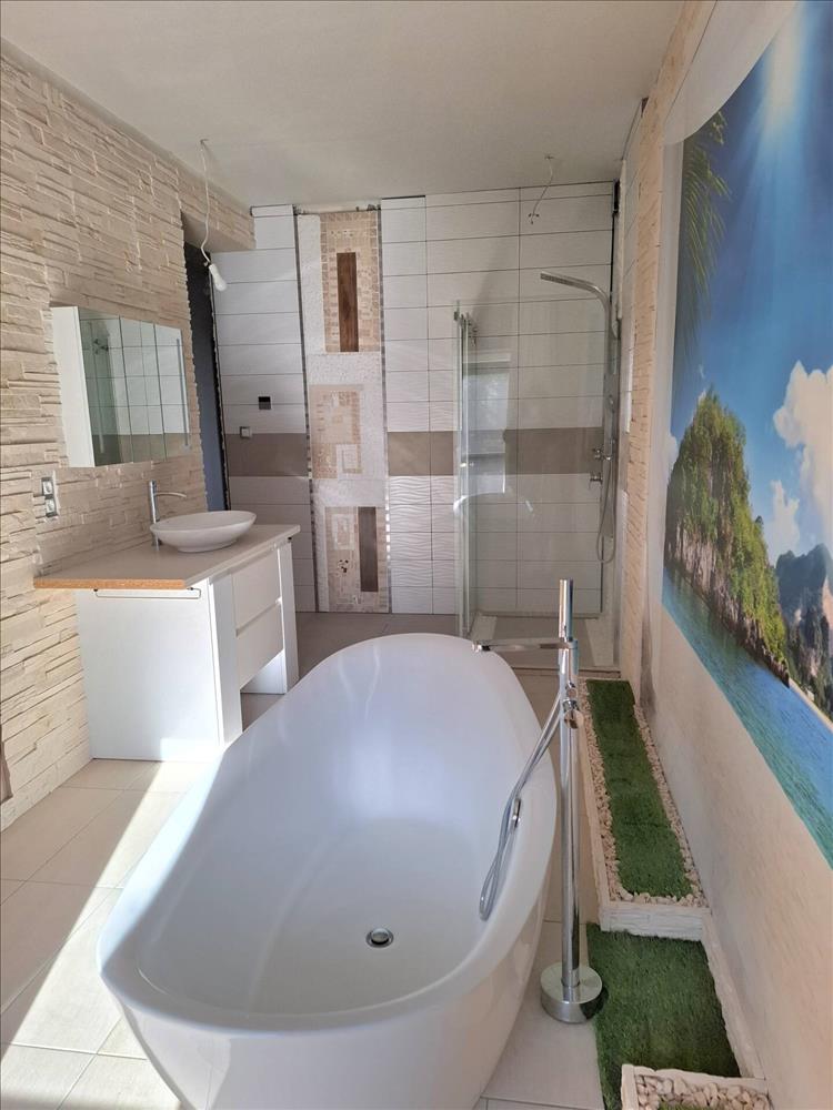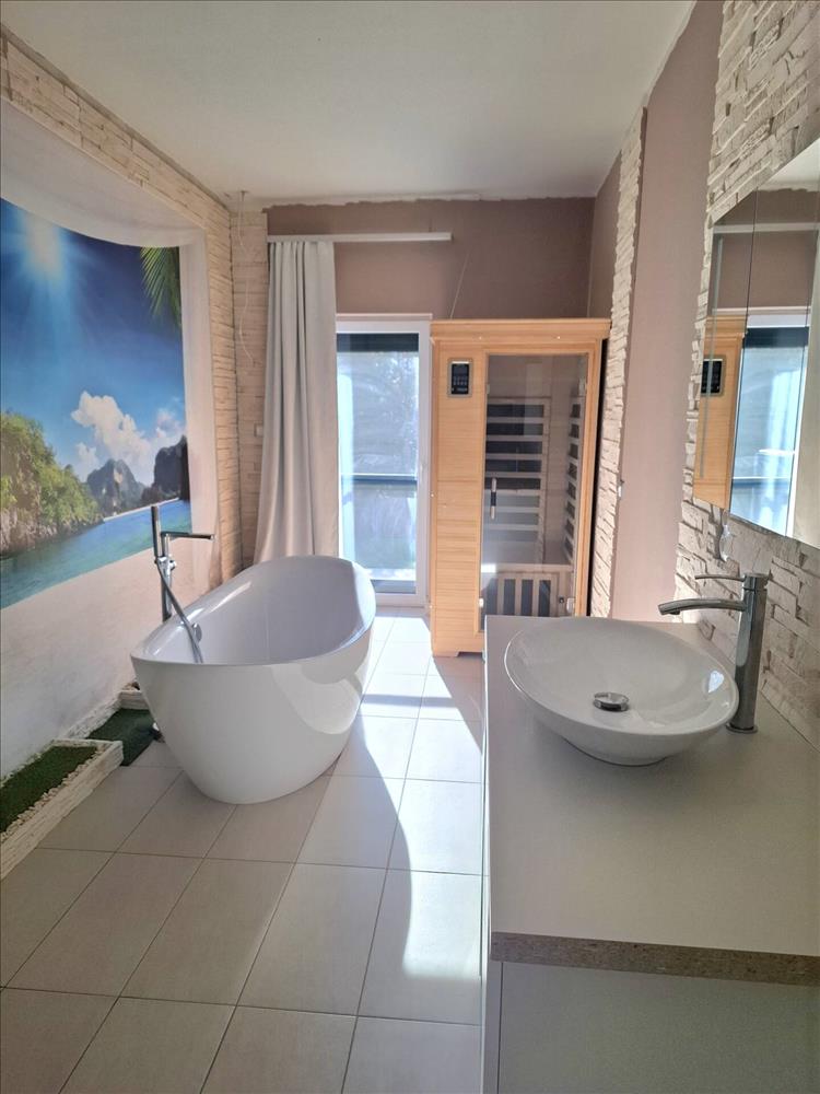 terasz kapcsolatos, és egy fürdőszoba káddal, szaunával. a fürdőszoba szintén teraszra nyíló.