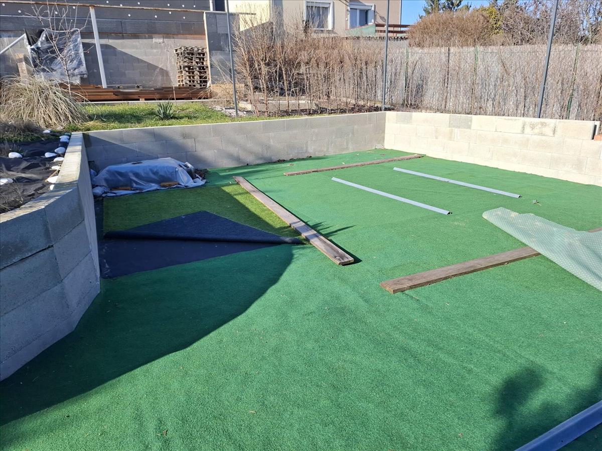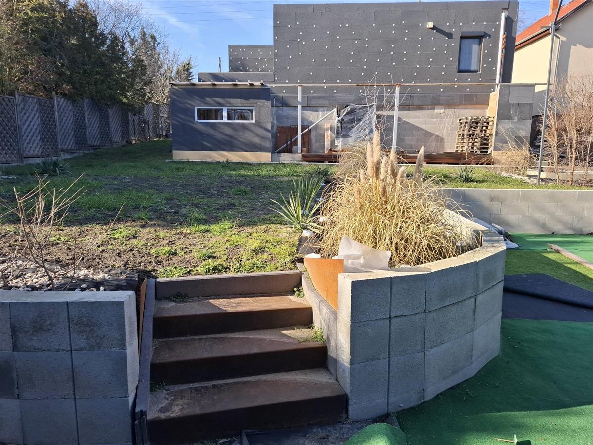 A hátsókertben kialakításra került egy betonozott alap, ahol akár medencét akár kerti kiülőt lehet kialakítani.