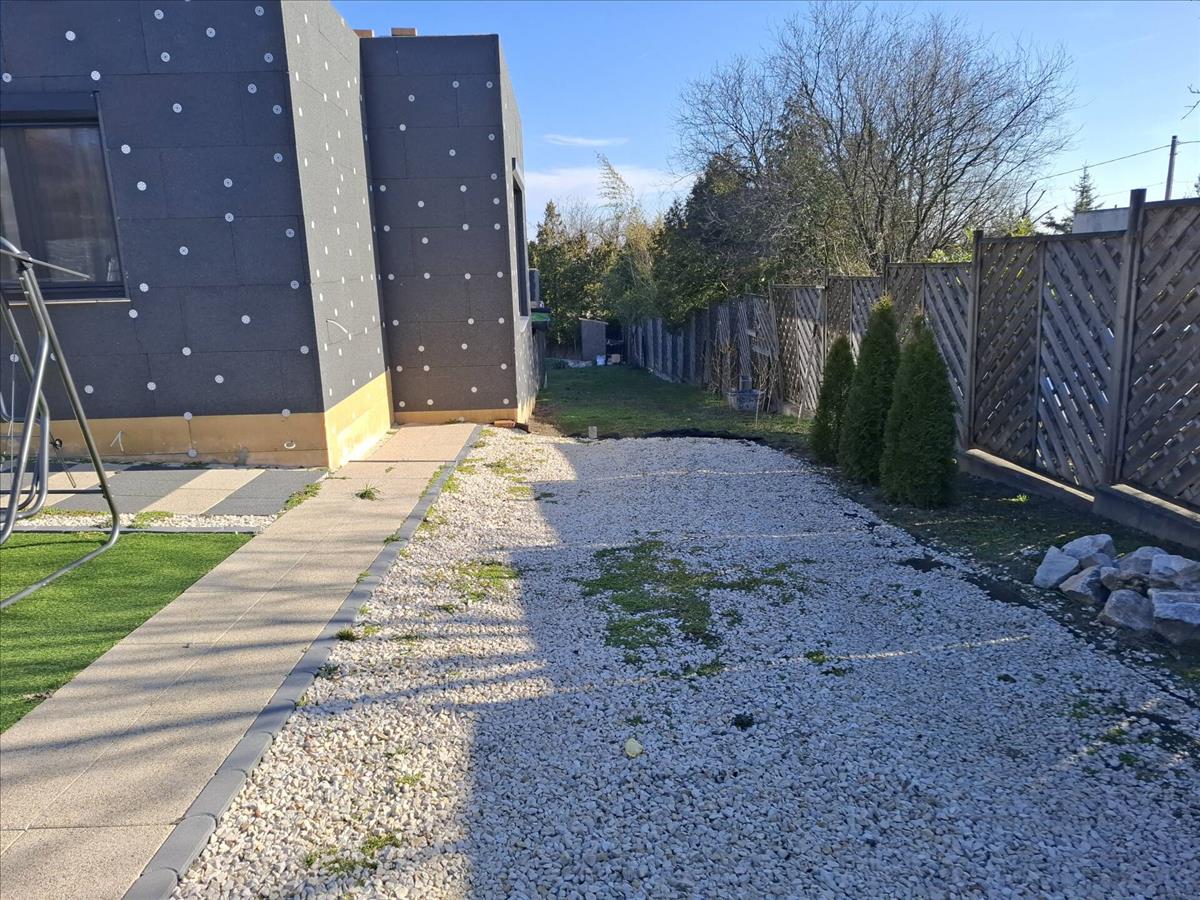 Az előkert térköves, műfűvel borított, és murvával díszített.