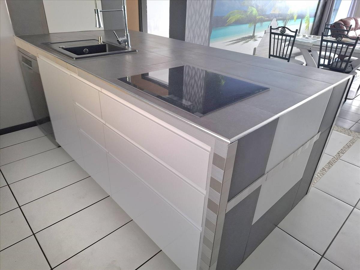 Tovább haladva pedig a nappaliba érünk, amely tágas amerikai konyhával, főzőszigettel felszerelt.