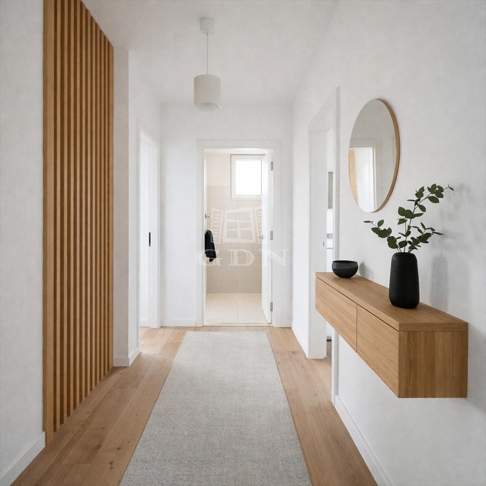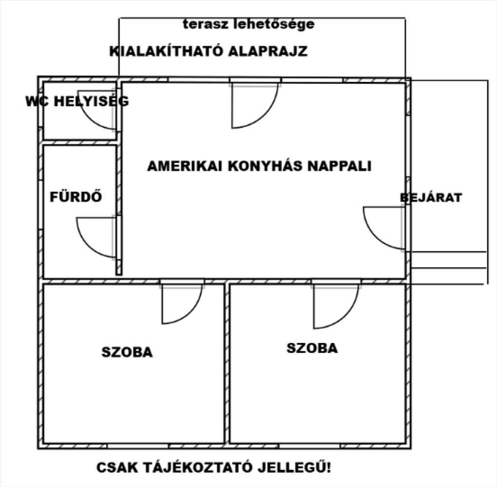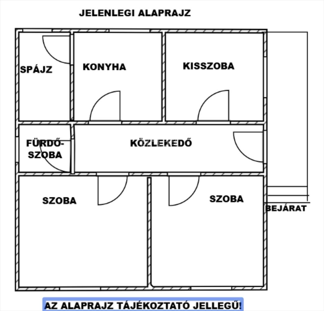 A közlekedő és a konyha, valamint kisszoba közötti falak bonthatók, válaszfalak, tehát ezek bontása után kialakítható egy modern, amerikai konyhás nappali, 2 szobás, fürdőszobás lakóház.