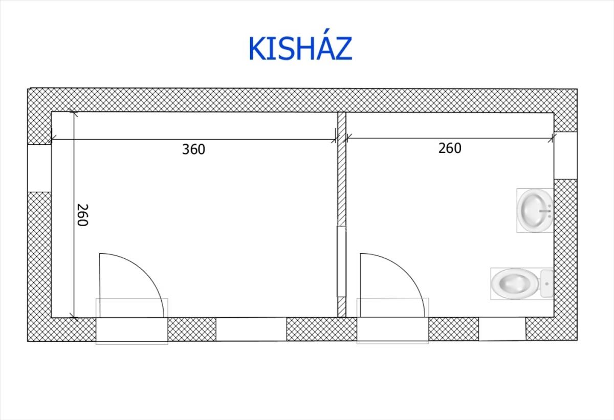 A kisházat nyárikonyhaként használták. Ide is be vannak vezetve a közművek. Ez az épület egy helyiségből és egy toalettből áll.