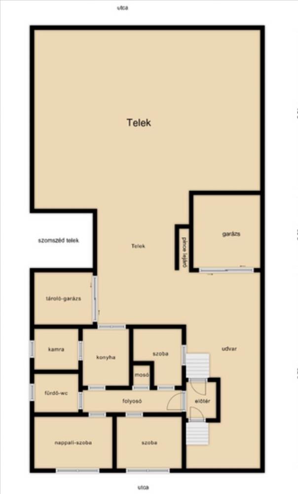 A kedvező elhelyezkedésű telek két utcáról is megközelíthető, ami számos hasznosítási lehetőséget kínál.