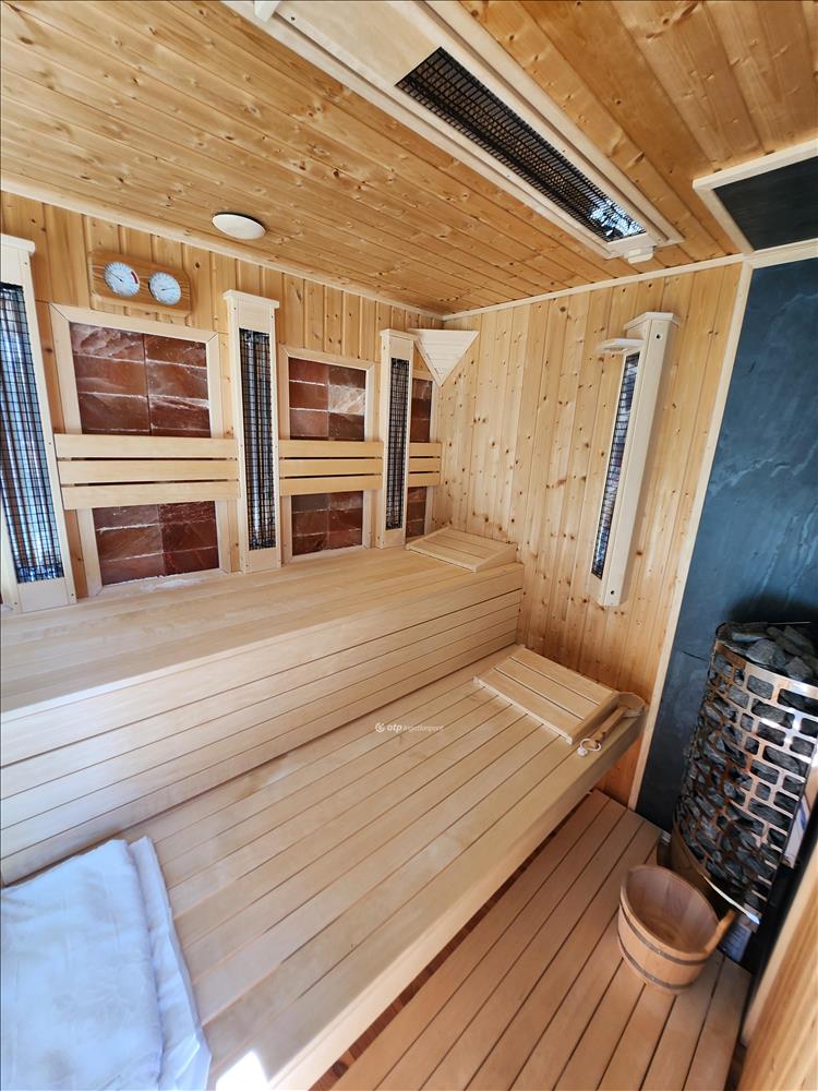 A kültéri rész igazi ékköve a 7×4 méteres sósvizes medence, ellenáramoltatóval, napozórésszel, hőszivattyús temperálással és automata vízkezelő rendszerrel. a különálló szaunaház finn- és infraszaunával, sótéglás sóterápiás fallal, saját fürdővel felszerelt. Mindezt egy intim, beérett növényzettel övezett kert veszi körül, automata öntözőrendszerrel és saját fúrt kúttal.