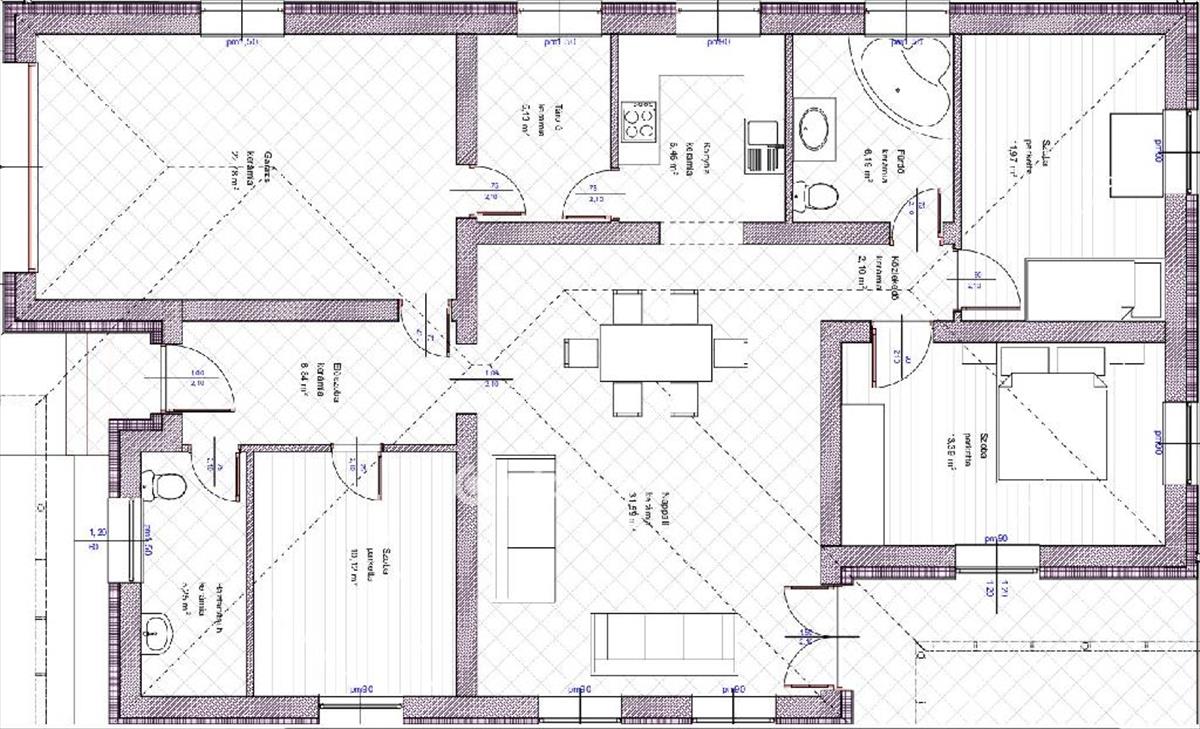 A 121, 8 m2-es alapterület optimálisan osztott: tágas nappali-konyha-étkező, három kényelmes hálószoba, fürdőszoba és külön háztartási helyiség teszi praktikussá a mindennapokat.