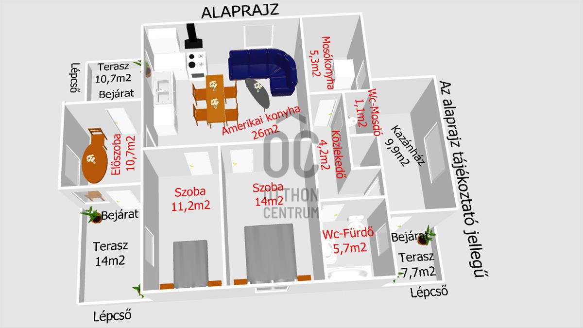 - Amerikai konyha, két tágas szoba, illetve több terasz, ami a nettó méretbe nincs belekalkulálva