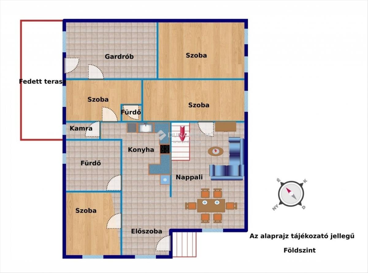 Hasznos lakótér 156 m2 + 15 m2 fedett terasz. Elosztását tekintve: Földszint: - Tágas előtér- Nappali- Konyha kamrával- Szülői háló saját fürdővel- 3 szoba- Gardrób helyiségT