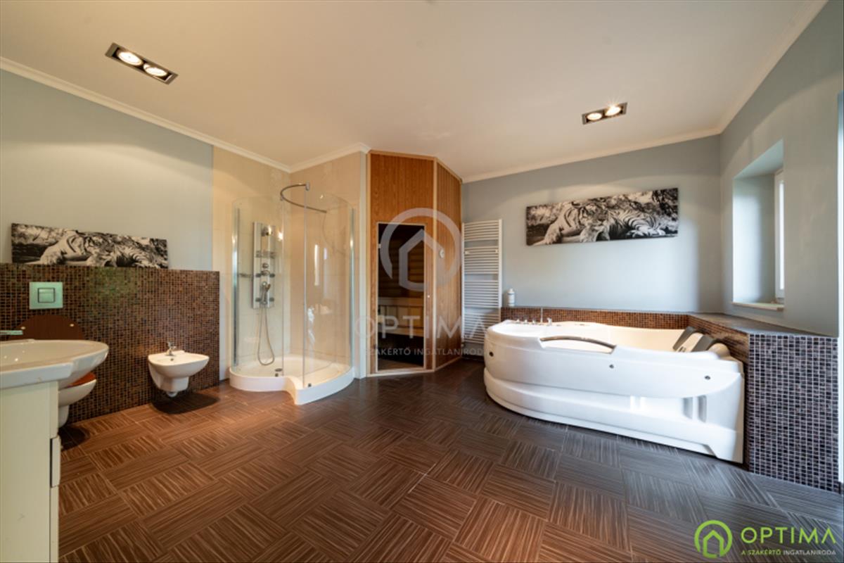 Eladó Érd csendes, zöldövezeti Parkvárosában egy igényes, 240 m² alapterületű, nappali + 3 hálószobás családi ház, 1300 m²-es telekkel, privát wellness-részleggel és 30 m²-es, vízforgatós medencével.