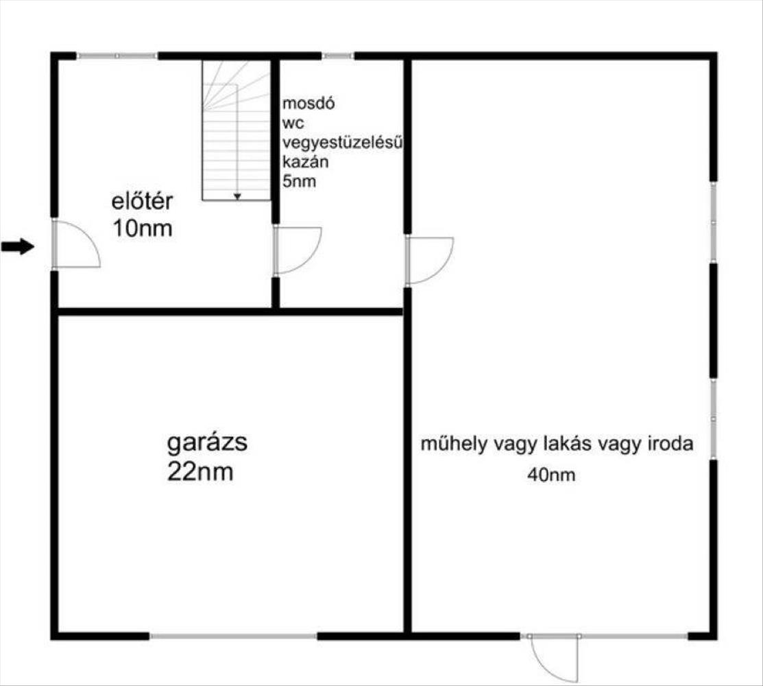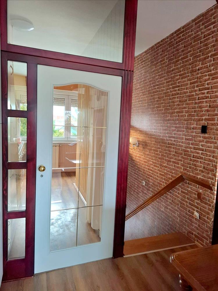 került kialakításra. Itt kapott helyet a vegyes tüzelésű kazán is. a családi ház másik oldaláról nyíló bejáraton keresztül egy tágas előszobába érkezünk. Innen egy igényes falépcső vezet fel az emeletre. a házat jellemzi a minőségi fa bútorok, beépített szekrények, egyedi ajtók. Az emeletre felérve tágas, világos konyha étkezővel fogad minket. Mellette spejz is kapott helyet, ahonnan nyílik a padlásfeljáró. Három szoba, egy fürdőszoba tusolóval, és külön egy wc+bidével teszi kényelmesebbé a mindennapjainkat. Minden szobában hatalmas ablakok ( redőnnyel ) teszik igazán otthonossá a házat.