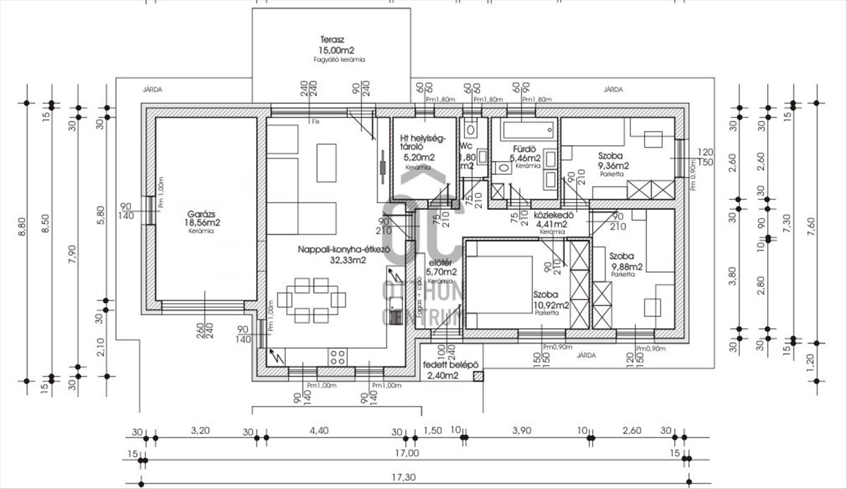 A ház kialakítása ideális családok számára: tágas közösségi tér, külön hálószobák és praktikus kiszolgáló helyiségek.