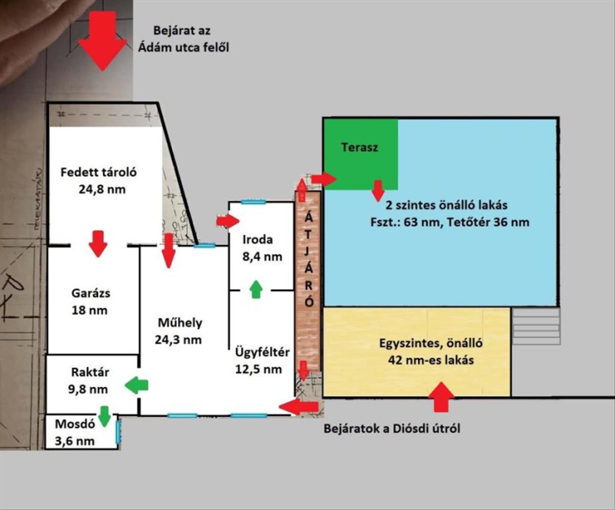Az üzlethelyiség a Diósdi útról nyílik-, a családi lakórész pedig (szép ősfás kerttel) az Ádám utcáról.