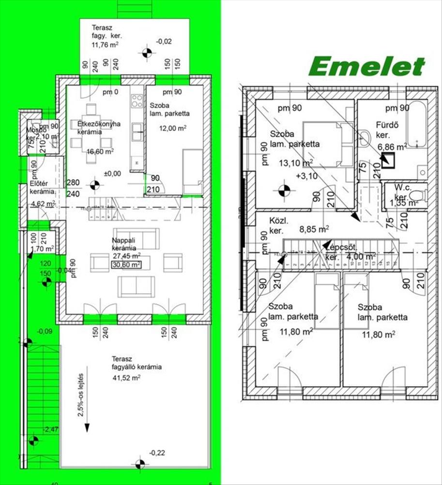 Földszint: Előtér 4, 62 m2, Mosdó-w. C. 2, 1 m2, Étkezőkonyha 16, 6 m2, Nappali 27, 45 m2, Szoba 12 m2, Lépcsőtér 4 m2,