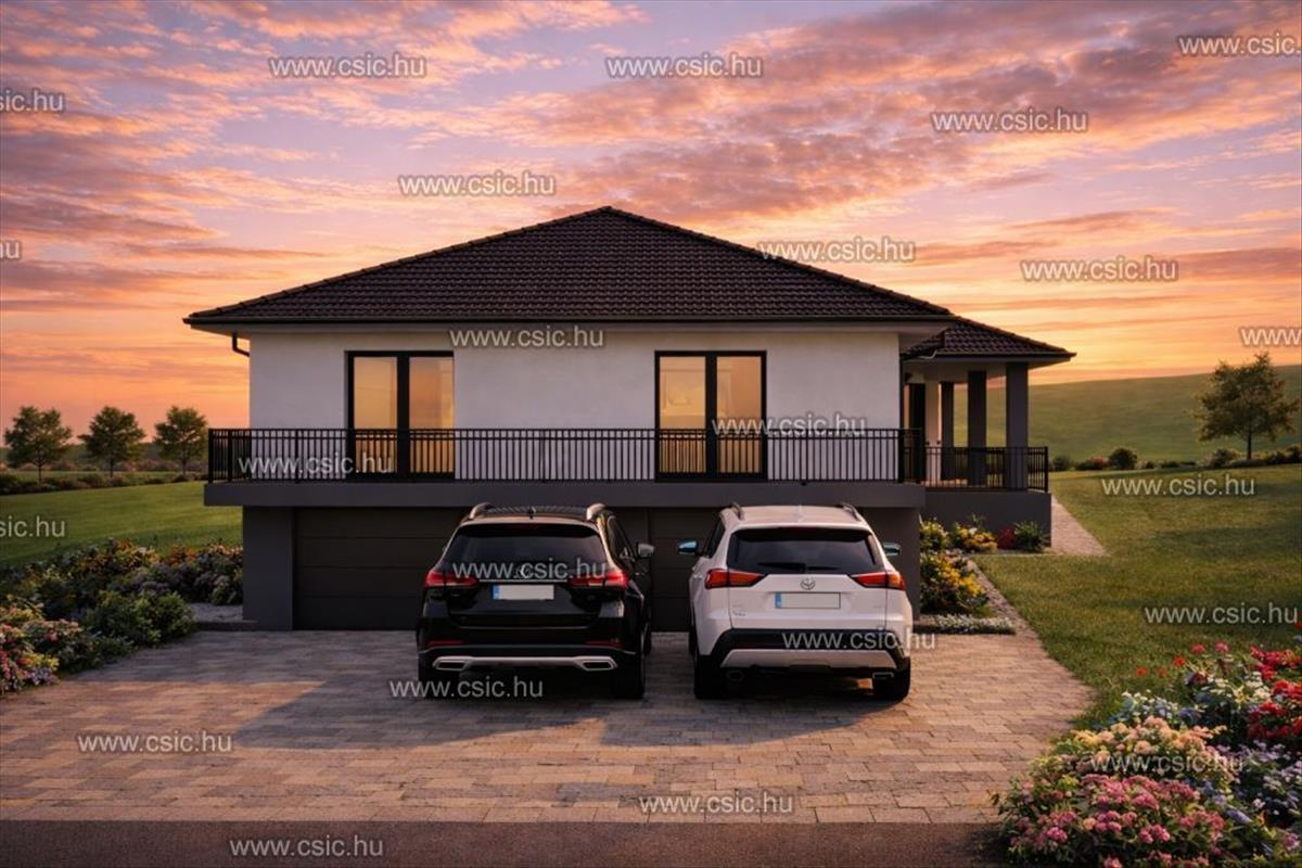 A garázs és a tároló külön szinten helyezkedik el, ahonnan belső lépcsőn (kb. 7 M²-es lépcsőházon keresztül) juthatunk fel a lakótérbe – praktikus és tiszta megoldás a mindennapokban.