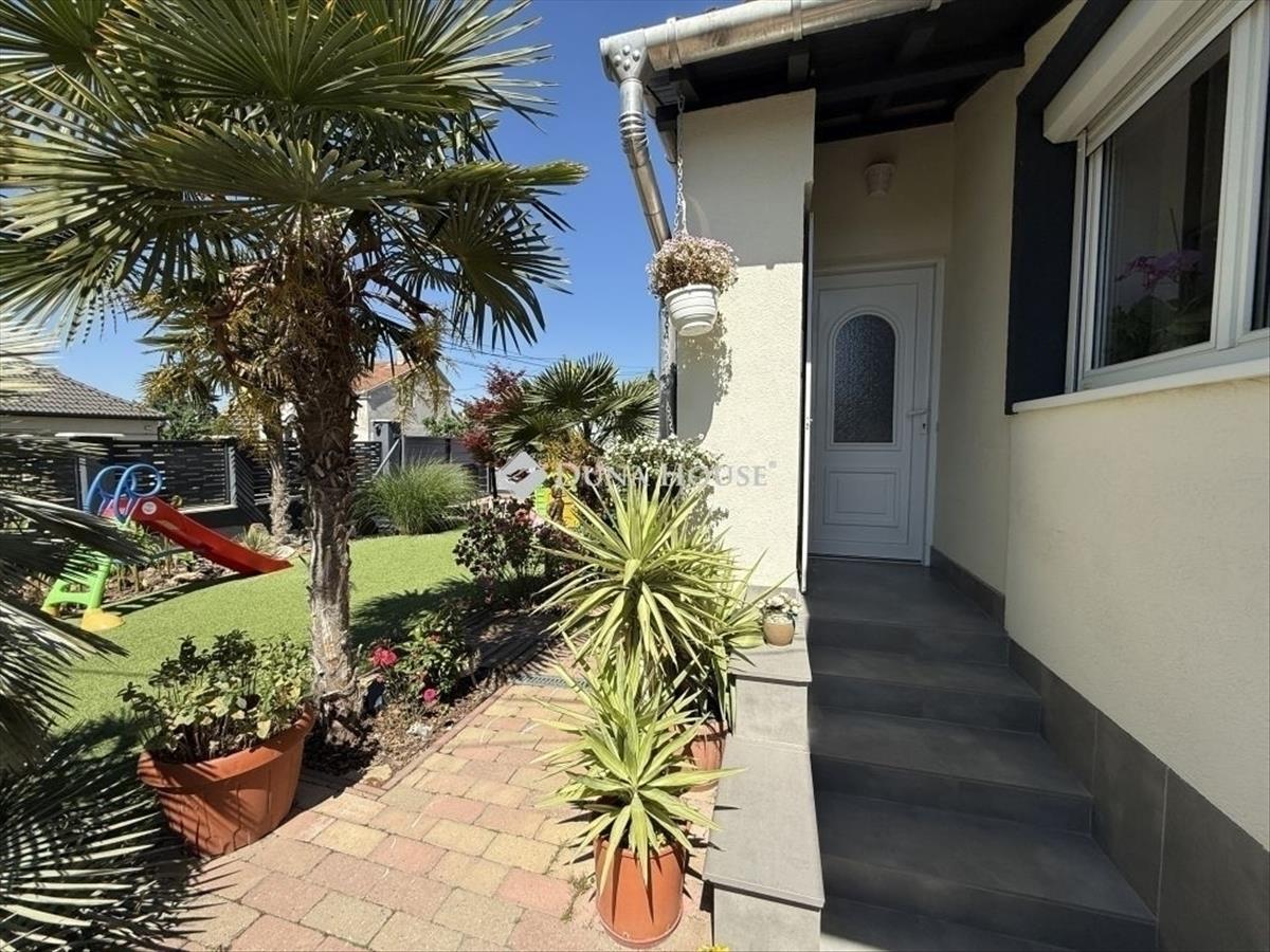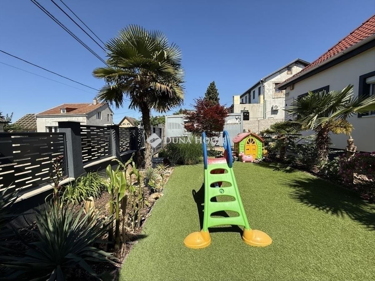 A telek szépen gondozott, összközműves, 548 m2, hangulatos pálmákkal és növényzettel, műfűvel. Található még egy tároló is, ahol biciklit, fűnyírót lehet tárolni.