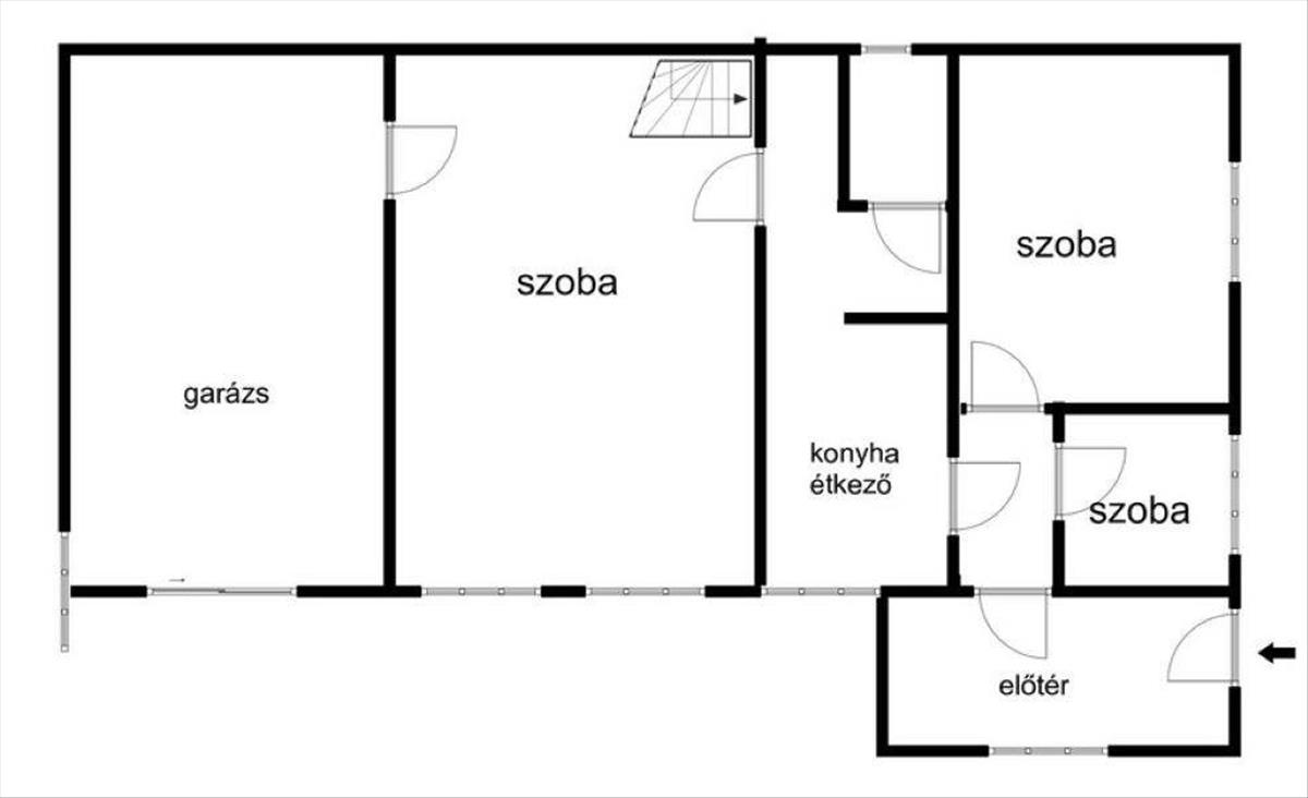 Az alsó szinten előszobából konyhába és a szobába jutunk. a szobából lehet az emeletre feljutni.