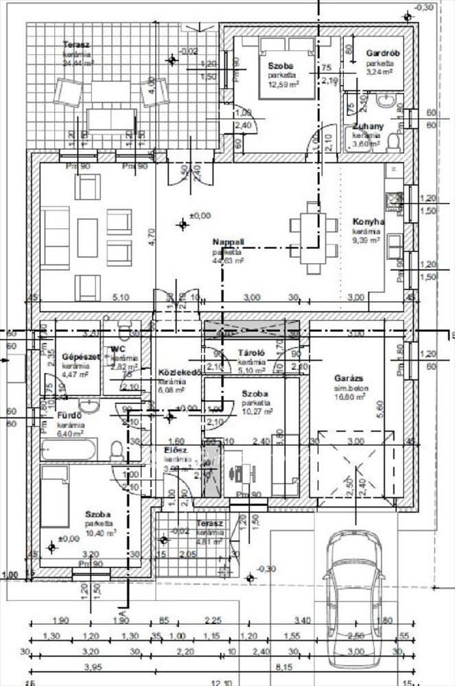 Új építésű családi ház, jól élhető terekkel, praktikus alaprajz, nappali+3 szoba, gardrób, két fürdő, háztartási helyiség, tároló, garázs, TERASZ.