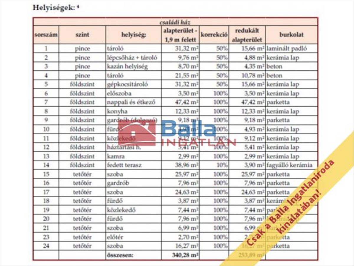 Összes 1, 9 m feletti terület: 340, 28 m² (szuterén/pince + földszint + tetőtér; ebben benne van a garázs és a fedett terasz is)