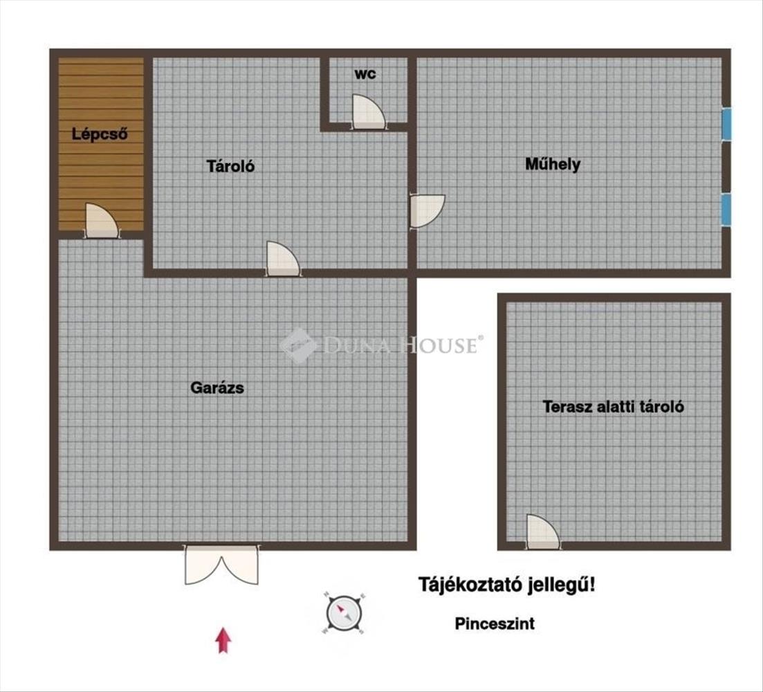 A pinceszinten (65 nm ) található a 20 nm -es garázs motoros kapuval, valamint két további helyiség, amelyek tárolásra vagy hobbi célokra is jól használhatók. Az udvaron további parkolási lehetőség is adott.