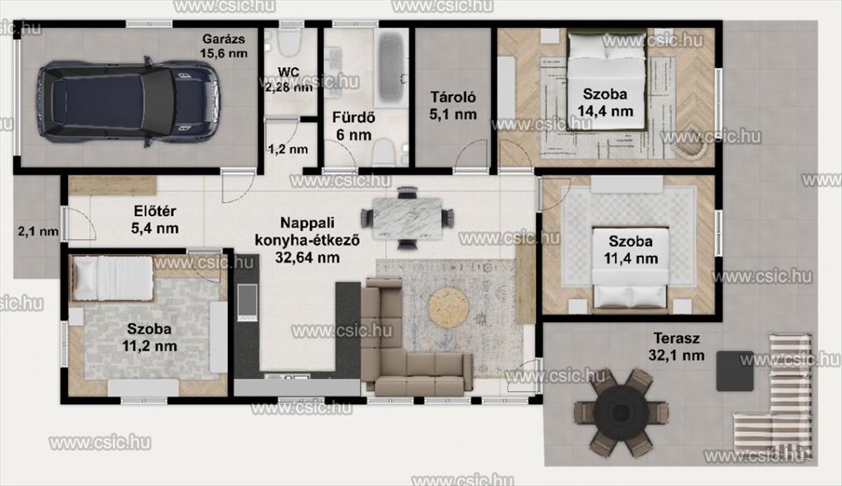 A nettó 105 m²-es, energiatakarékos otthon világos terekkel, praktikus elrendezéssel és korszerű műszaki tartalommal készül.