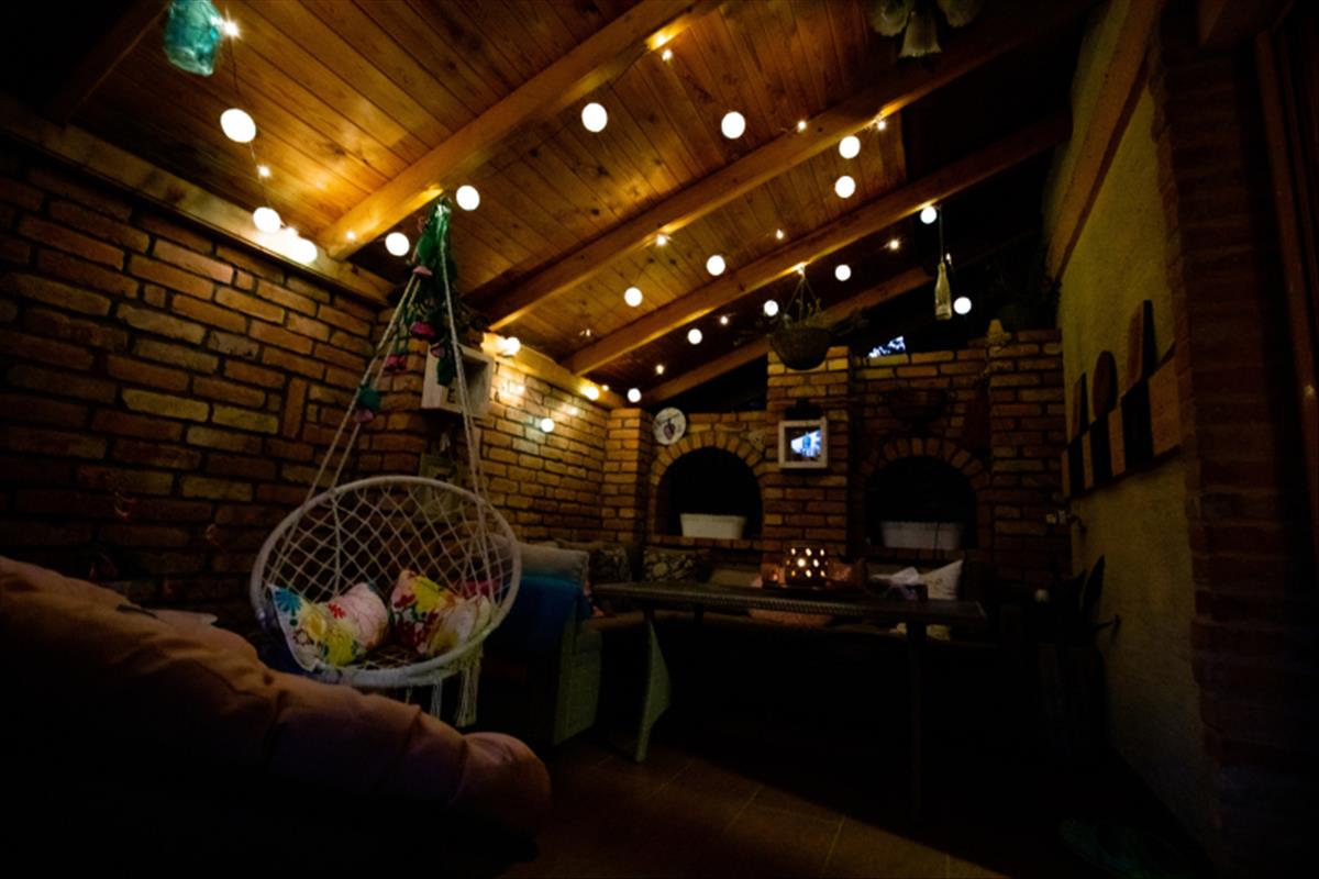 A nappaliból közvetlen kapcsolat nyílik a hangulatos teraszra, amely ideális reggeli kávéhoz vagy esti beszélgetésekhez.