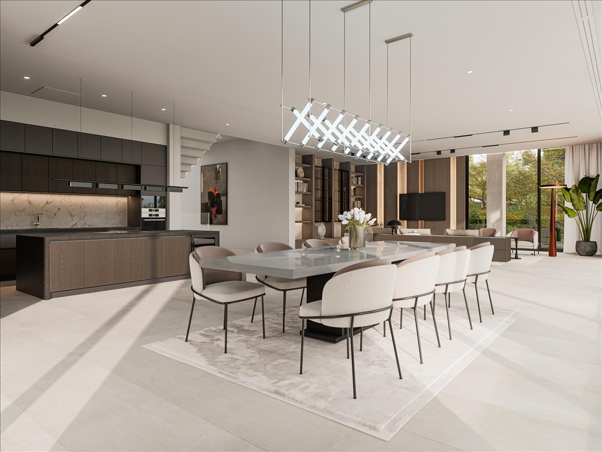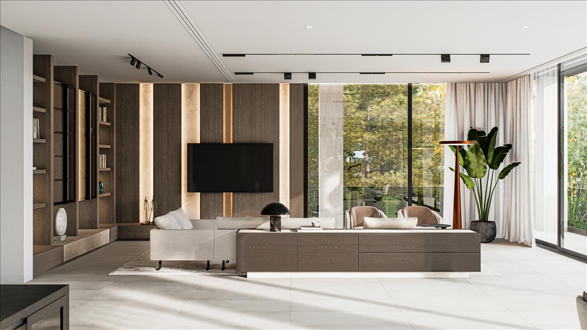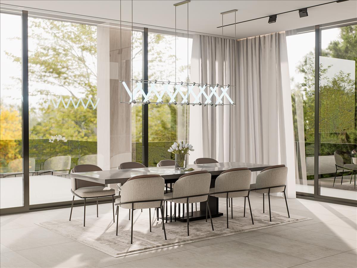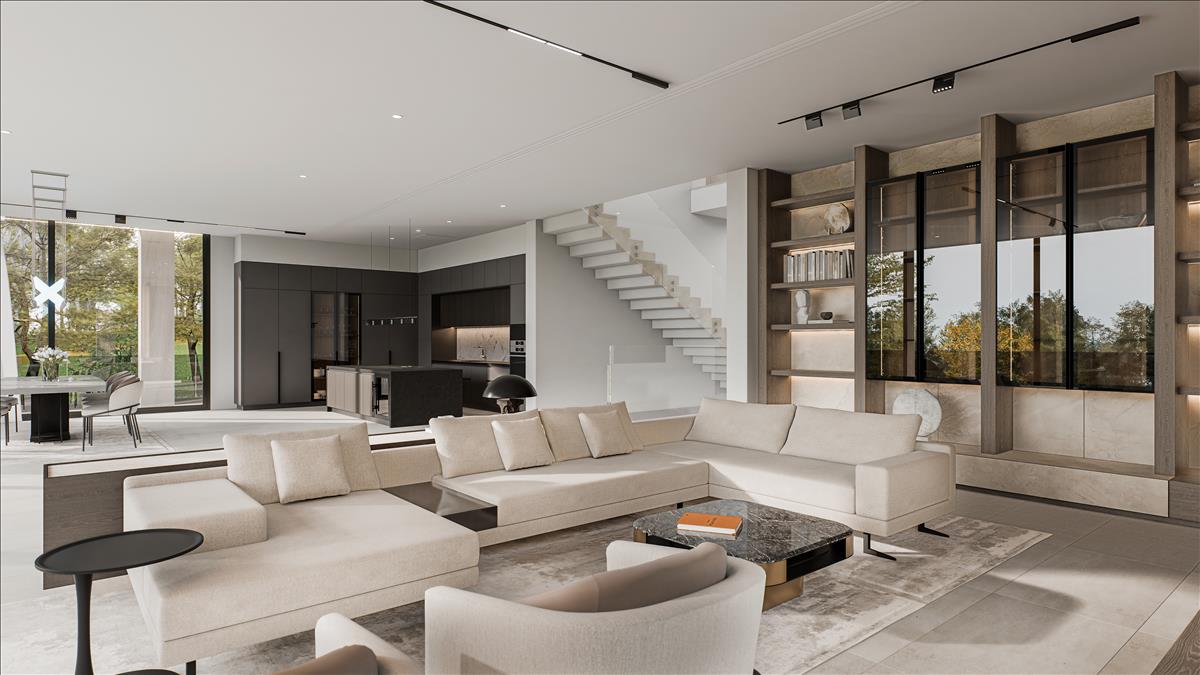 A grandiózus 8 méter magas átrium már az első pillanatban magával ragad. Innen tárul fel a 146 m²-es nappali, ahol padlótól mennyezetig érő üvegfelületek keretezik a látványt – mintha maga a természet lenne az enteriőr része. Az U alakú terasz az élet örömét ünnepli: ideális hely reggeli napfényhez, esti borhoz vagy vendégek fogadásához.