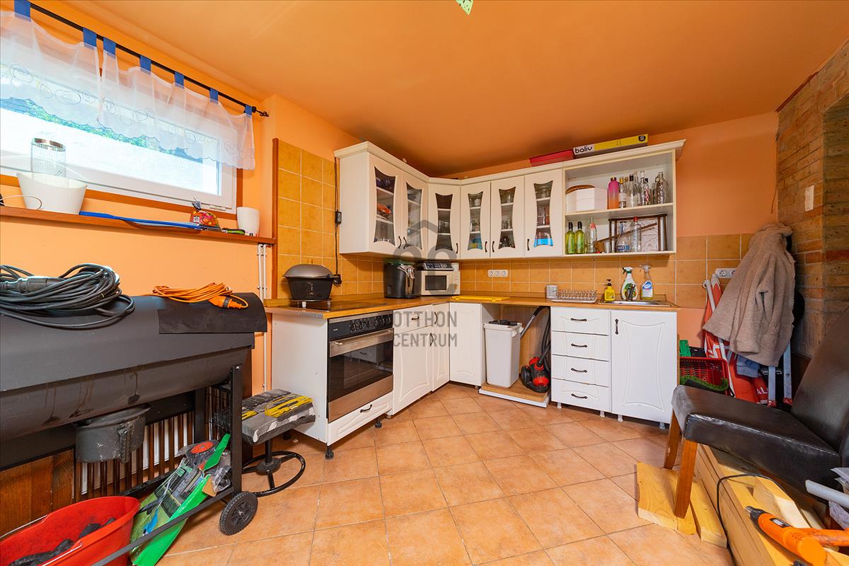 - a szuterén részen (valóságban földszint a telek lejtése miatt): kialakított konyha, kamra. Hálószoba, előszoba kialakítható, így egy garzonként funkcionálhat vagy vállalkozásra tökéletesen alkalmas