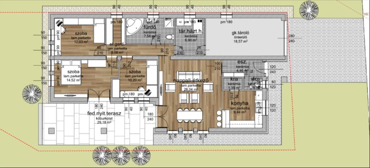 Parkolás: garázsban, valamint a garázs előtt kialakított kocsi beállón lehetséges, a kapu elektromos előkészítése megtörténik.