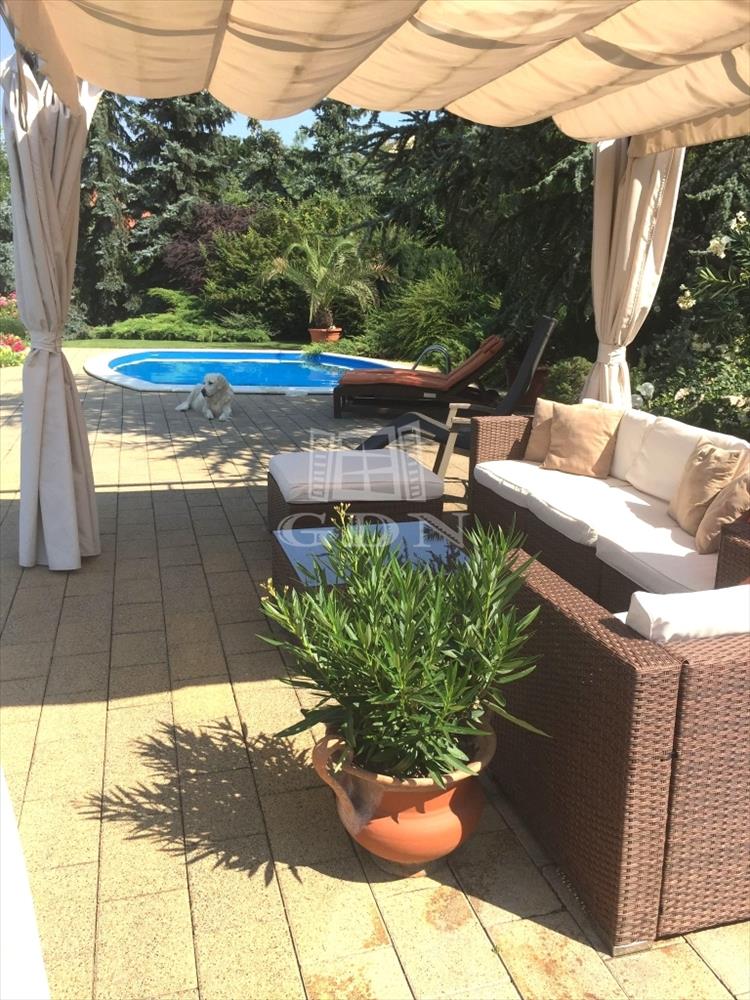 Csendes, mégis remekül megközelíthető kertvárosi utcában eladó egy impozáns, 3 szintes, nettó ~200 m²-es, folyamatosan karbantartott családi ház érett kerttel, medencével és különálló dupla garázzsal.