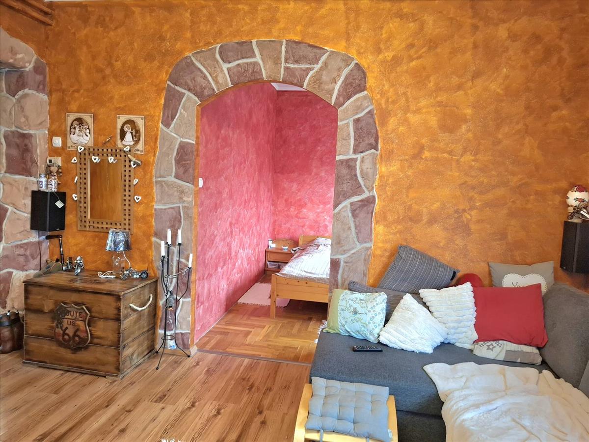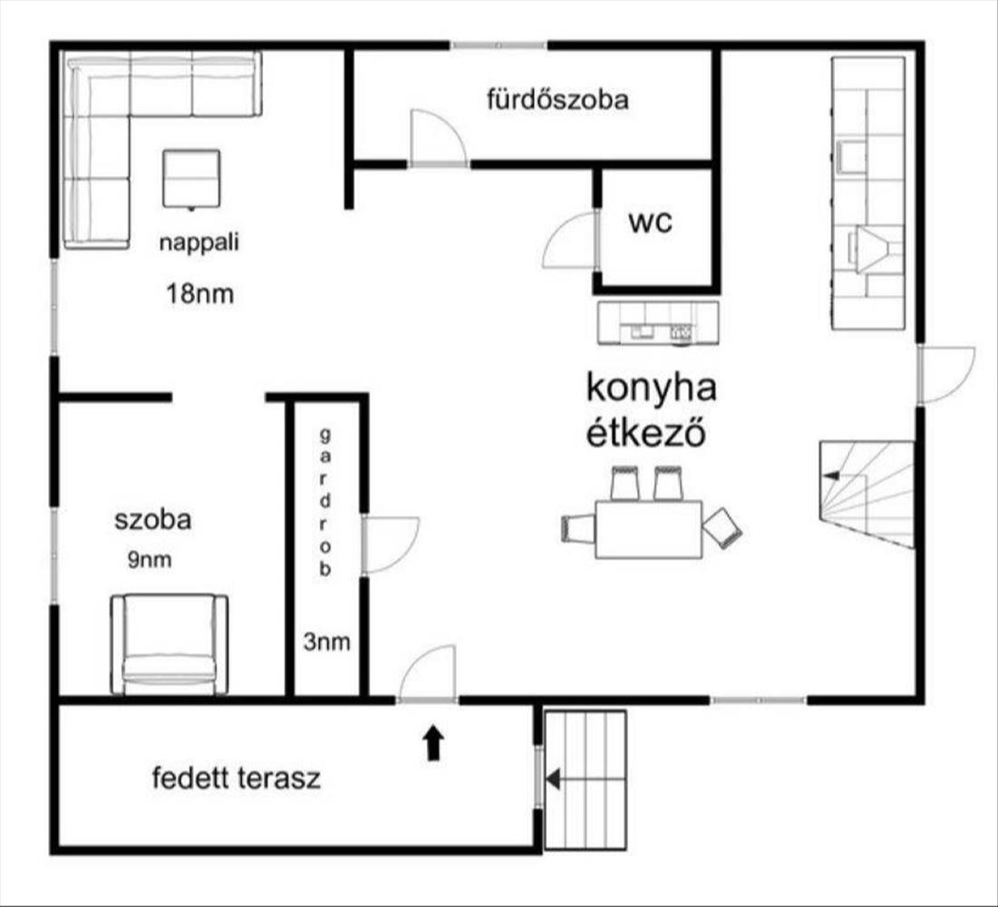 Az étkezőből nyílik a nappali, melyből egy 9 nm -es szoba került kialakításra. De megtalálható az alsó szinten a fürdőszoba,