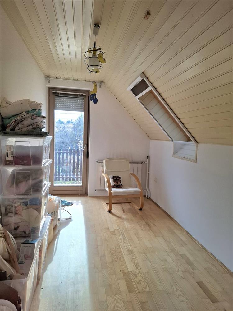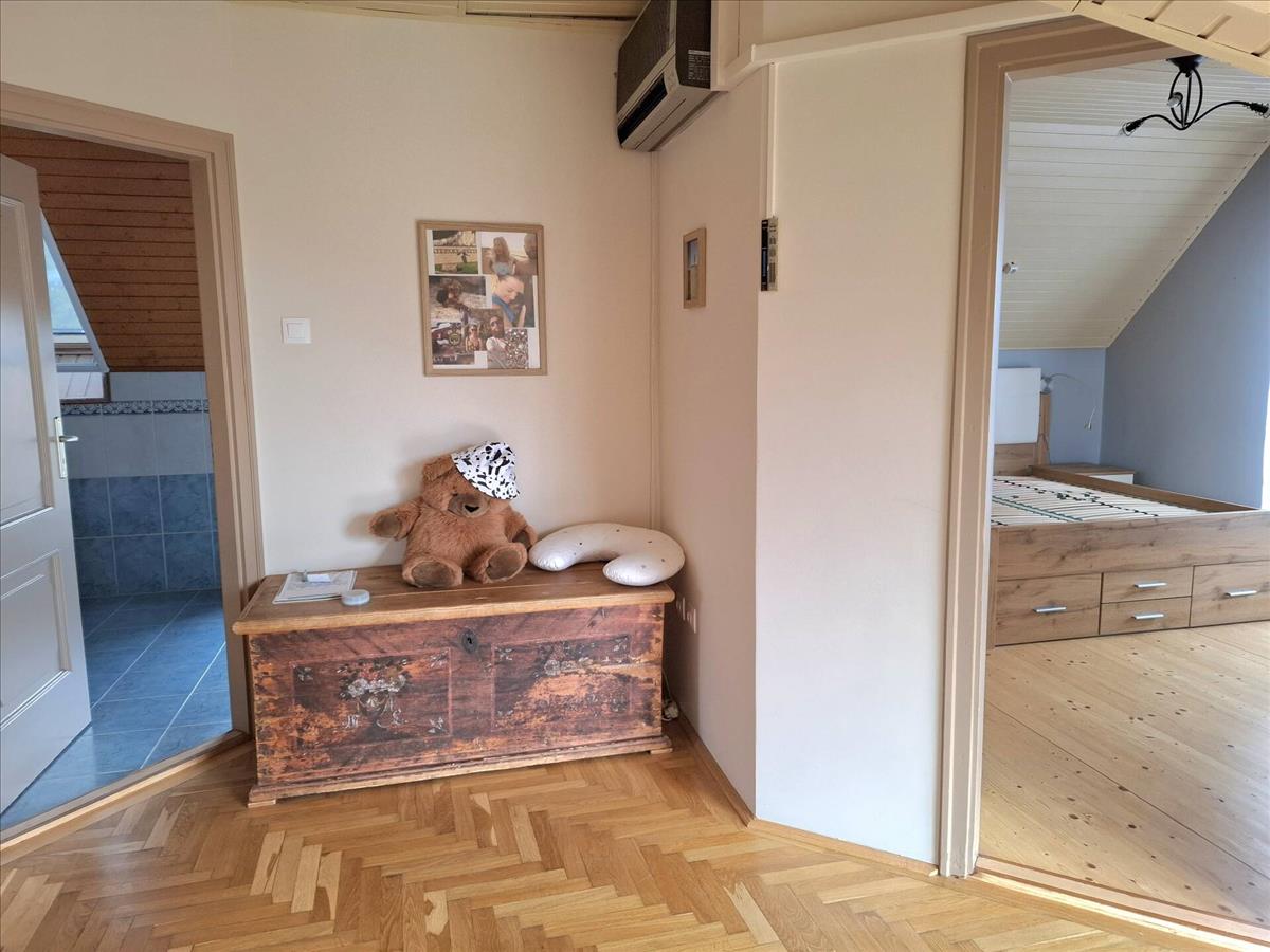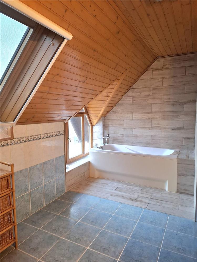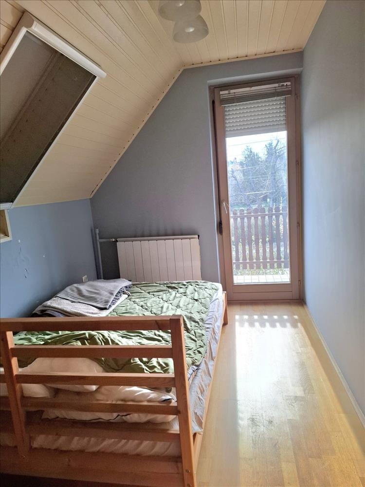 A pincébe, garázsba innen is lejutunk. Az emeletre kényelmes lépcső vezet fel. Itt három szoba, és egy nagy fürdőszoba szolgáltatja a kényelmet, kád és wc is megtalálható.