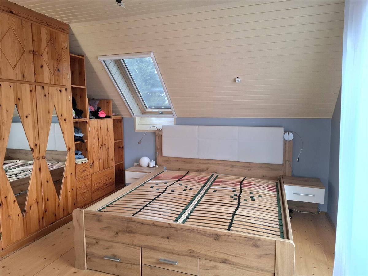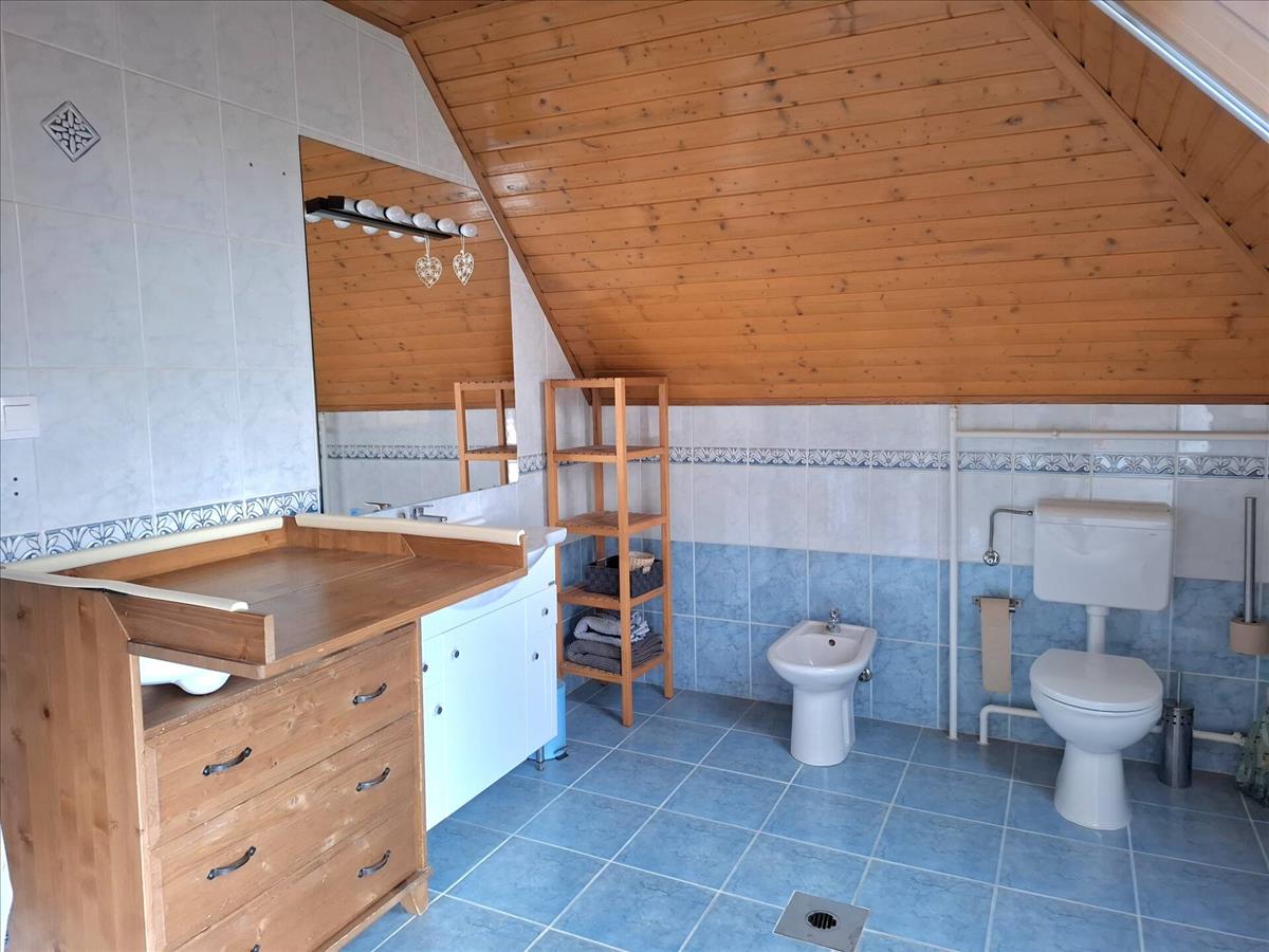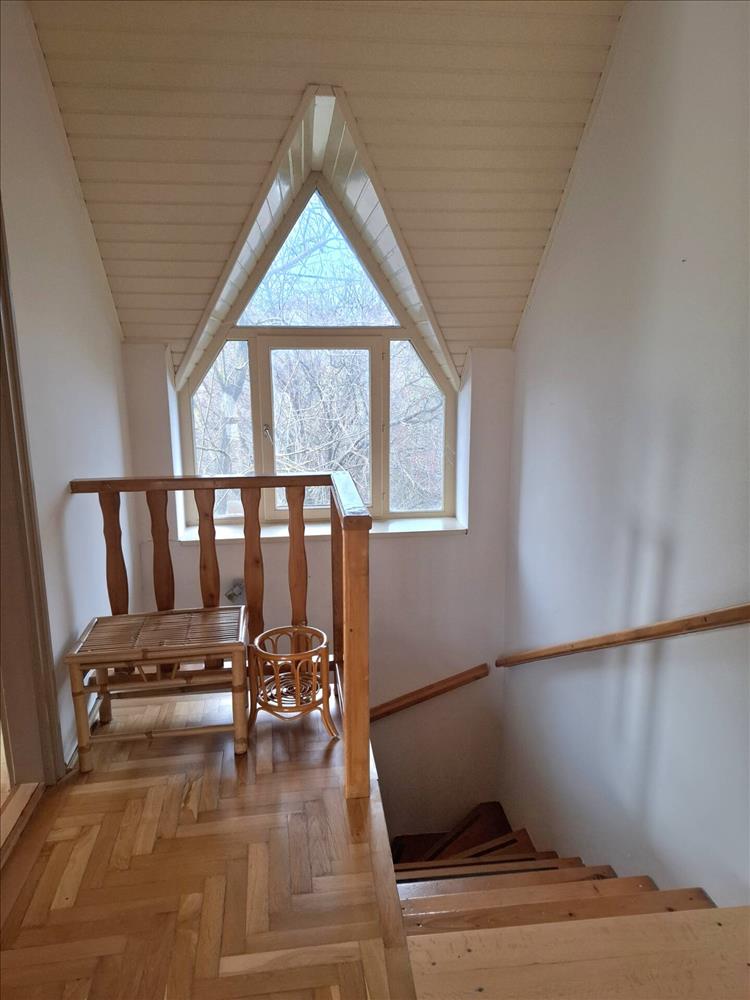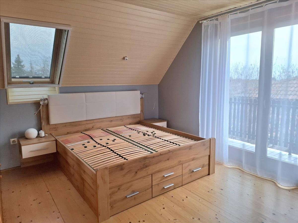 A pincébe, garázsba innen is lejutunk. Az emeletre kényelmes lépcső vezet fel. Itt három szoba, és egy nagy fürdőszoba szolgáltatja a kényelmet, kád és wc is megtalálható.