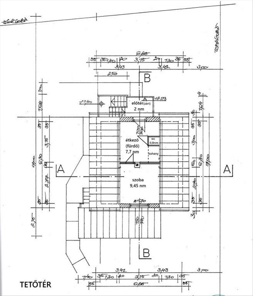 A tetőtérbe külső lépcsőn a ház hátsó részénél lehet felmenni, amely egy bővítéssel akár belső feljáróval is kialakítható. a tetőtérben egy szoba és egy zuhanyzós fürdőszoba, külön WC-vel található.