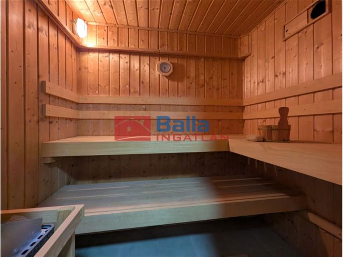 Az alsó szinten helyet kapott egy hangulatos szoba, egy üvegezett előtér / télikert, egy hálószoba, egy kis konyha, egy fürdőszoba, valamint egy 6 személyes finn szauna. Erről a szintről közvetlen kijárat nyílik a garázsba.