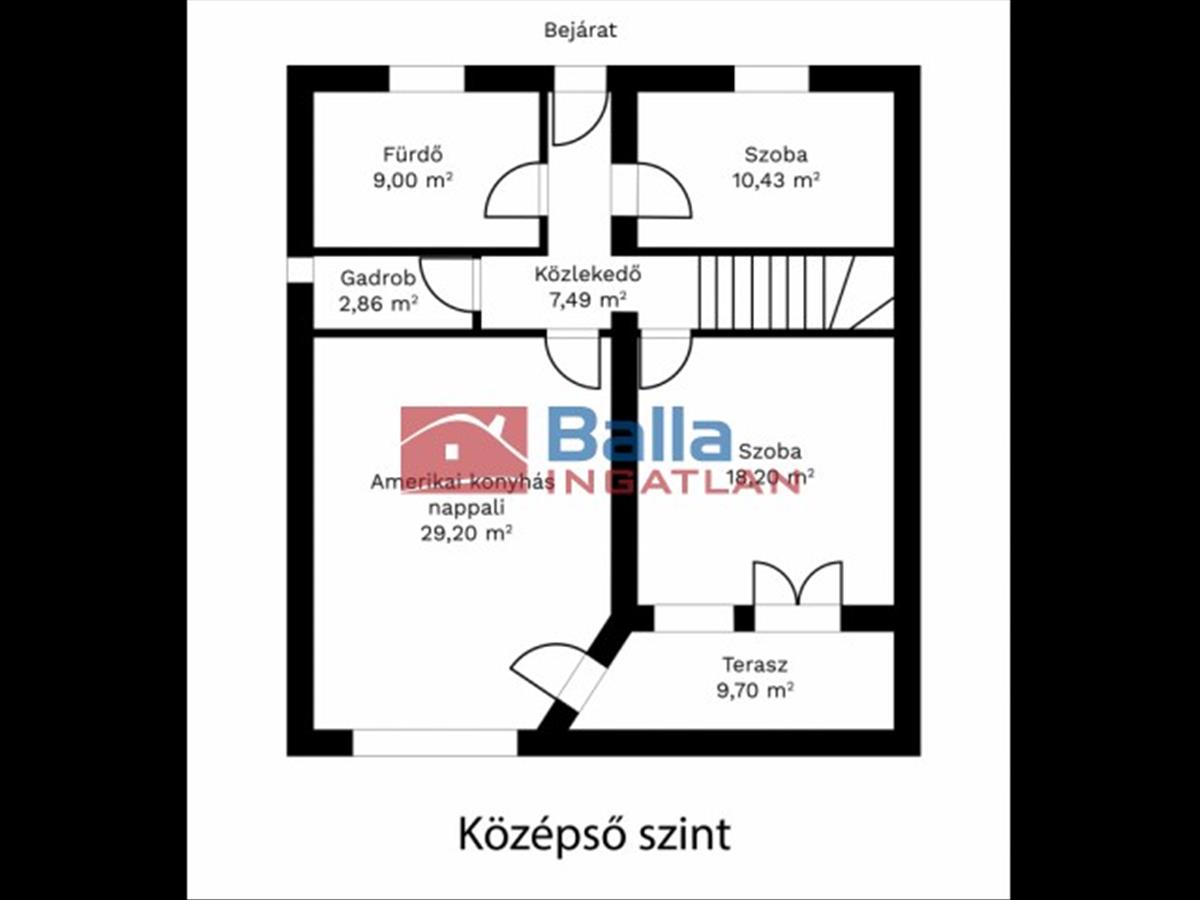 - Felső szint (belmagasság: 2, 60 m): élettér: 77, 18 m² + erkély: 9, 70 m² + fedett terasz: 30 m²