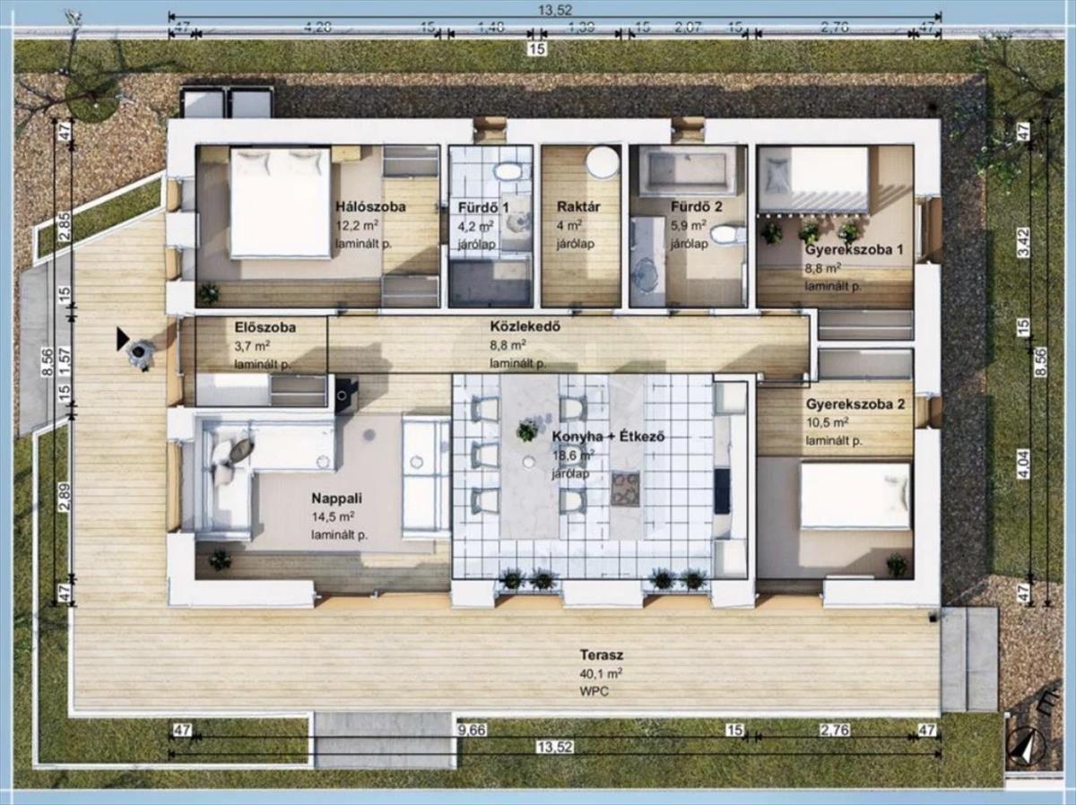 Az ingatlan belső kialakítása a mai elvárásoknak megfelelő: a tágas nappali és az amerikai konyha egy légtérben kapott helyet, amelyet a nagy belmagasság és a délnyugati tájolás különösen világossá és élhetővé tesz. a három külön nyíló szoba és a két fürdőszoba praktikus elrendezést biztosít, így családok számára is kiváló választás. a 40 négyzetméteres terasz közvetlen kapcsolatot teremt a kerttel, harmonikusan összekapcsolva a belső és külső tereket.