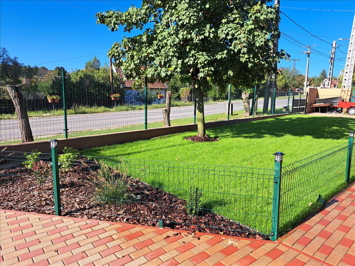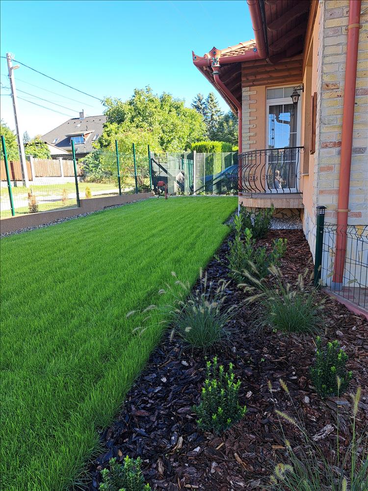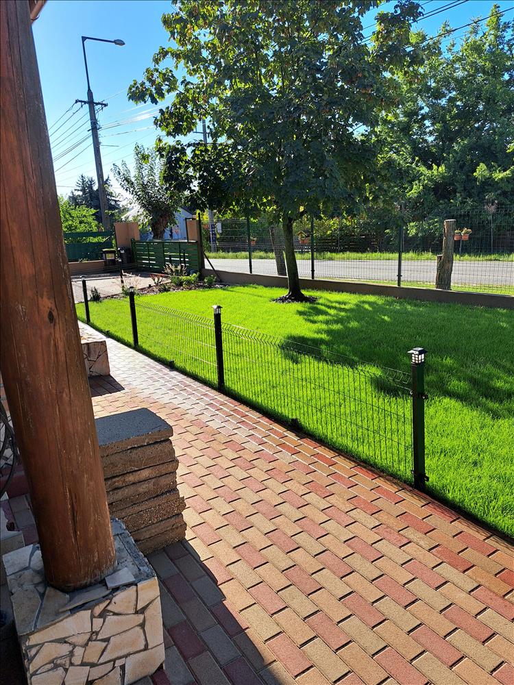Kovácsoltvasból készült teraszkorlát, új kerítés, elektromos kapu, gyepszőnyeg, programozható locsolórendszer van.