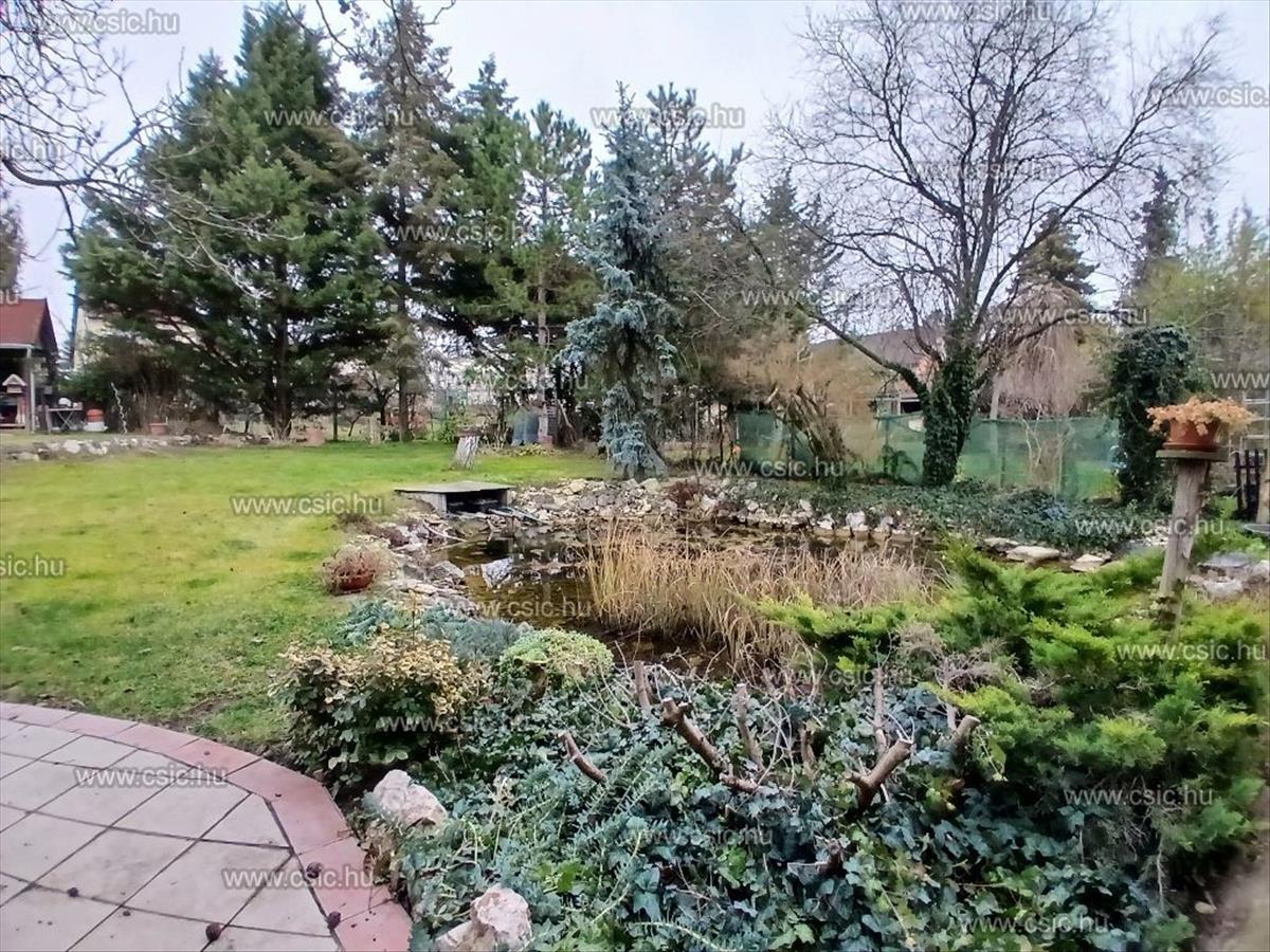 A 670 nm-es kertben fúrt kútról üzemelő halastó, ápolt pázsit, öntözőrendszerrel, 5m x 5m-es szaletli és egy fából készült tároló található.