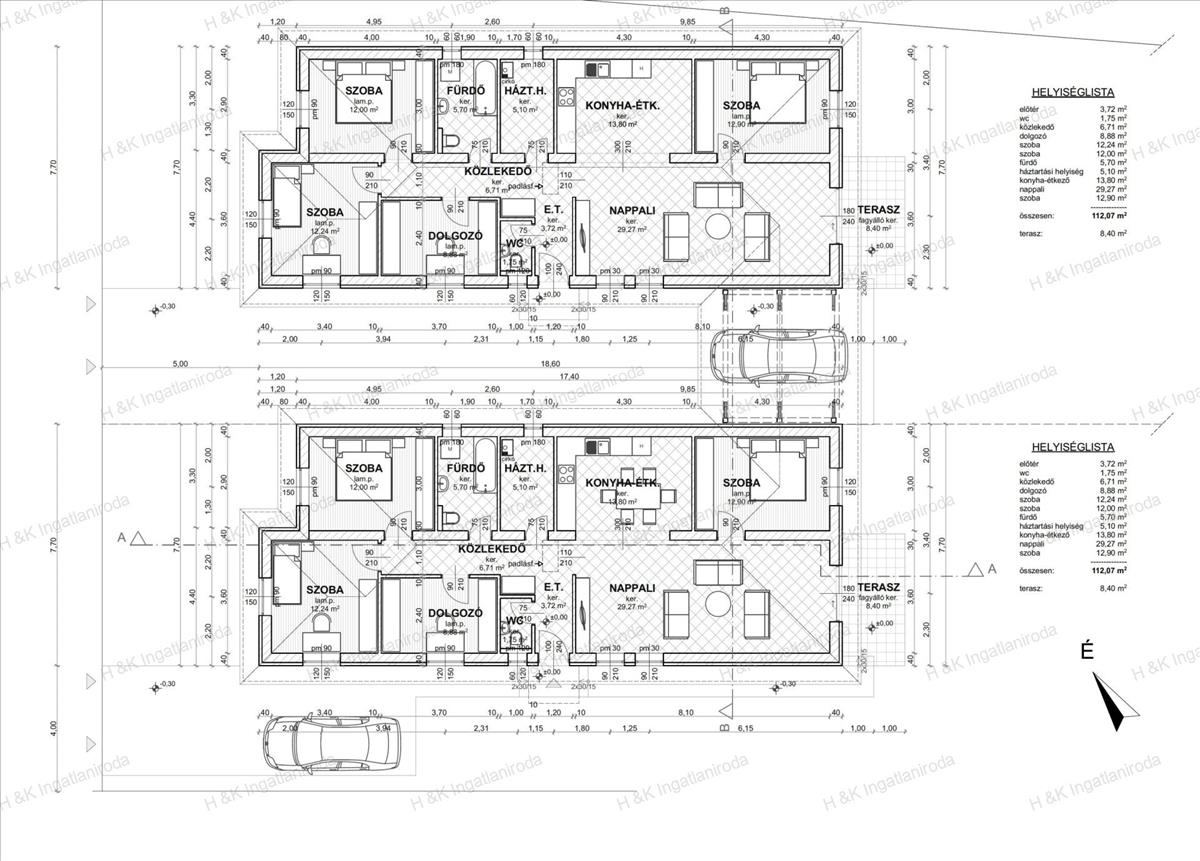 Az ingatlanok elrendezése kiváló: 112 nm hasznos alapterület (+ 8 nm terasz), nappali + 4 szoba, dupla-komfortos kialakítással, lakásonként nagy telekrészekkel (1-es lakás kb. 600 Nm, 2-es lakás kb. 690 Nm).
