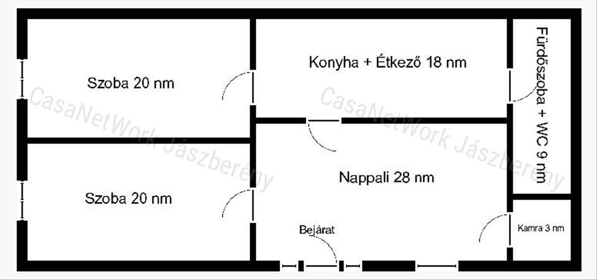 szobák: 20 m2, 20 m2, 28 m2-es, padlószőnyeggel borított, illetve betonos,