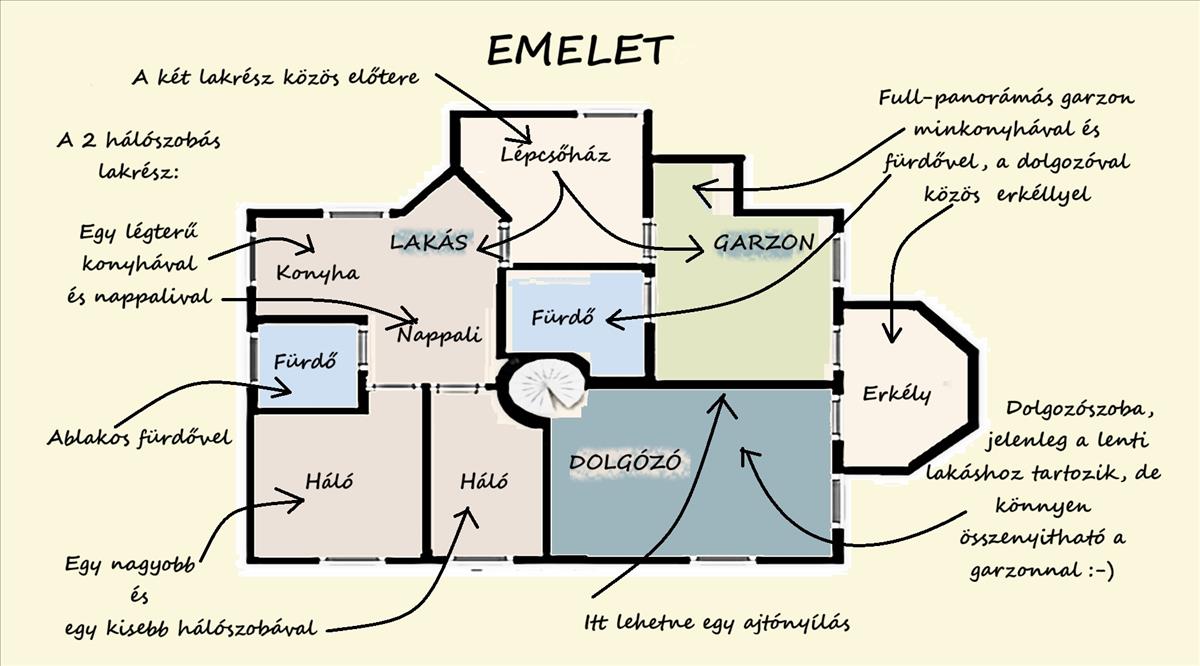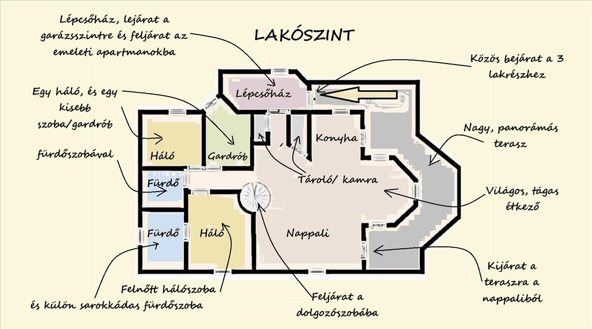 Panorámás nappali + étkező, konyha, 3 háló, 2 fürdő, tárolók + belső feljáratú felső emeleti erkélyes, panorámás "dolgozószoba"