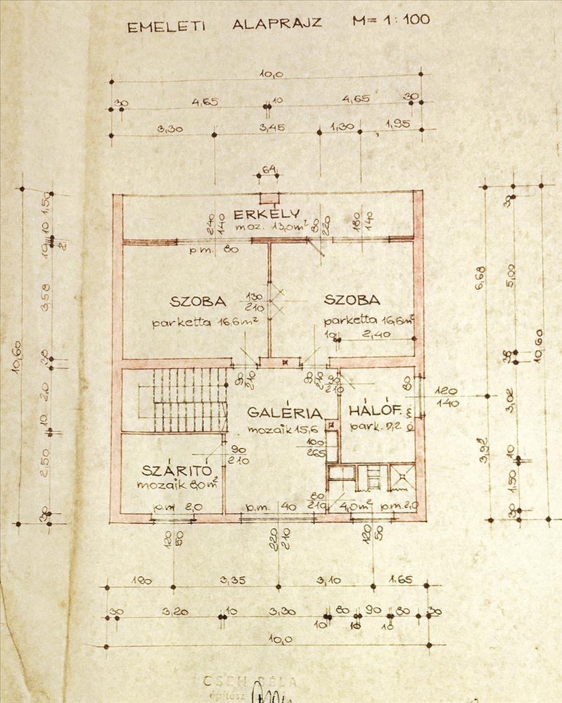 Emeleten középen egy tágas galéria, amiből „körbe” 2 fél/gyerekszoba, 2 nagy szoba (egyikből kijárat a ház teljes hosszában húzódó 13m2-es erkélyre) és egy fürdőnek tervezett helység nyílik.